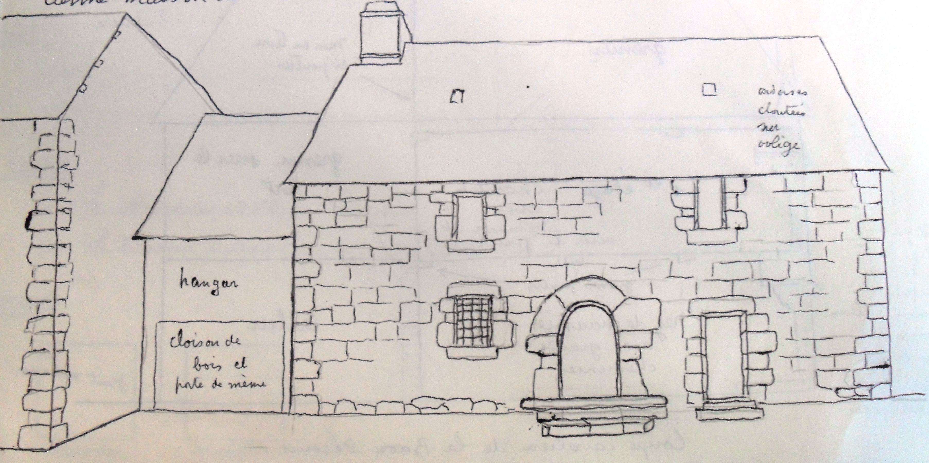 Dessin d'élévation effectué en 1968 de la façade sud de la plus vieille ferme de la Basse PérouseImmatriculation