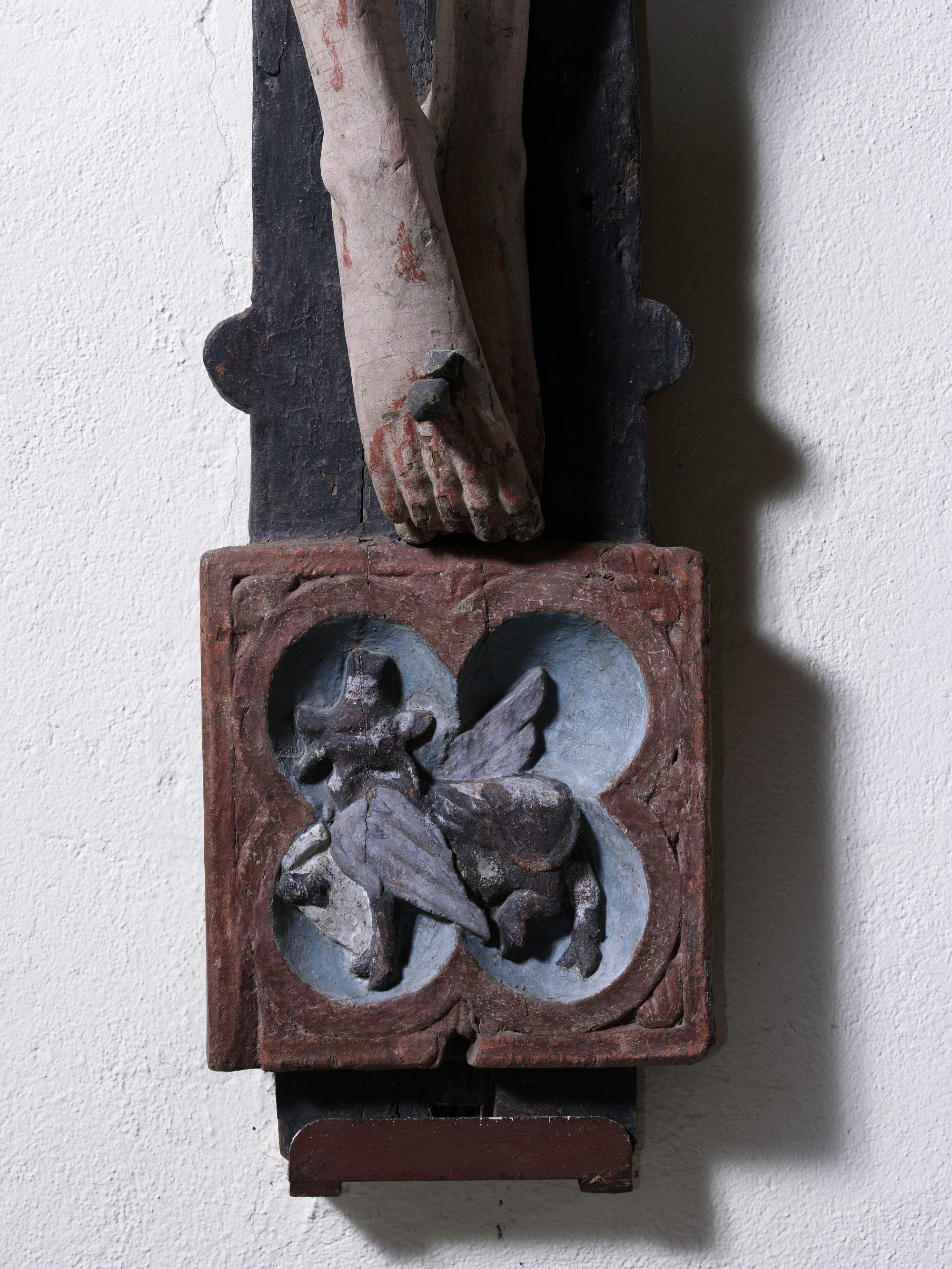 Christ en croix, partie inférieure de la croix : Boeuf de saint LucImmatriculation