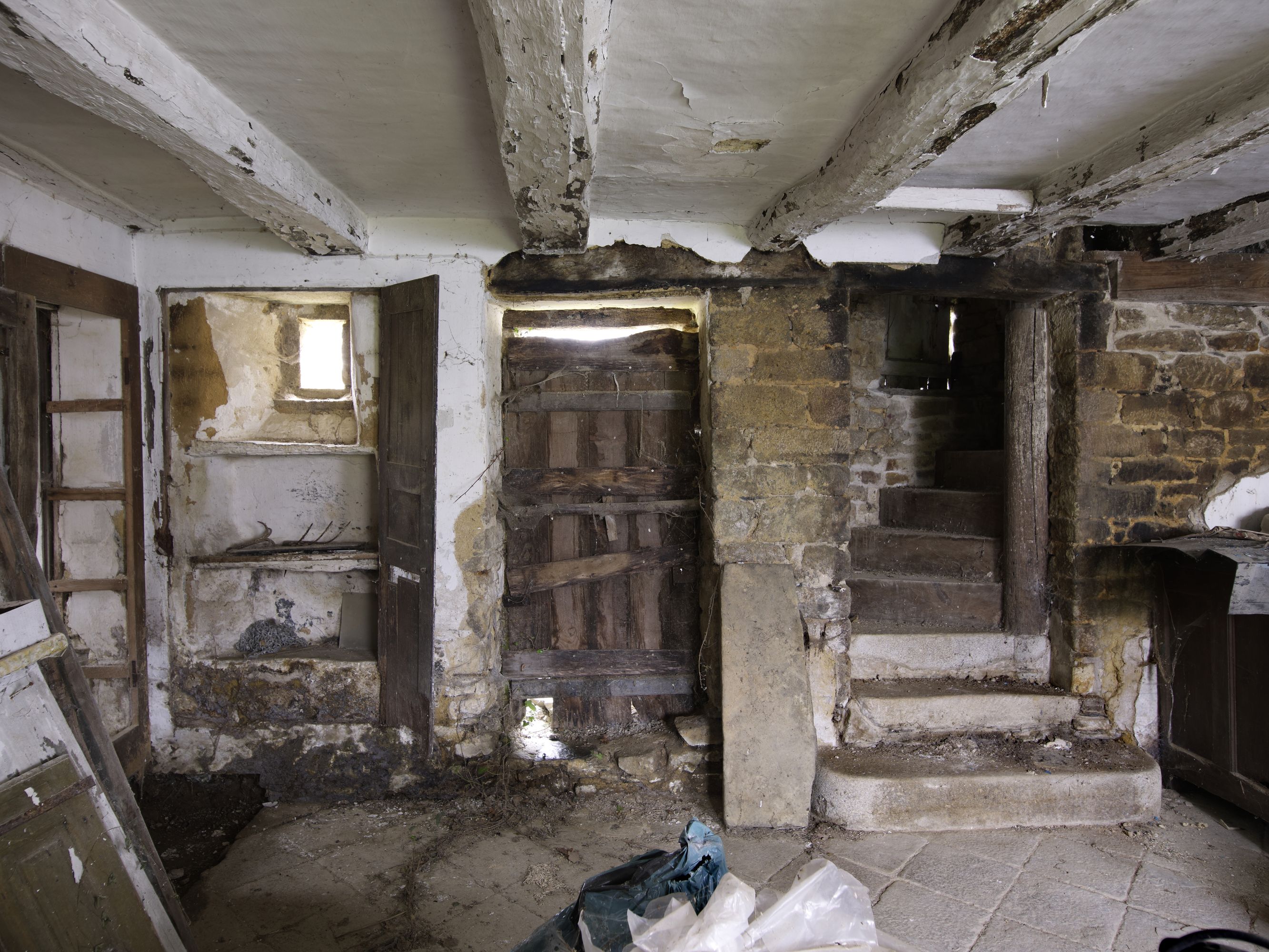 Rez-de-chaussée, vue du mur nord (étagère murale, porte et départ d'escalier)Immatriculation