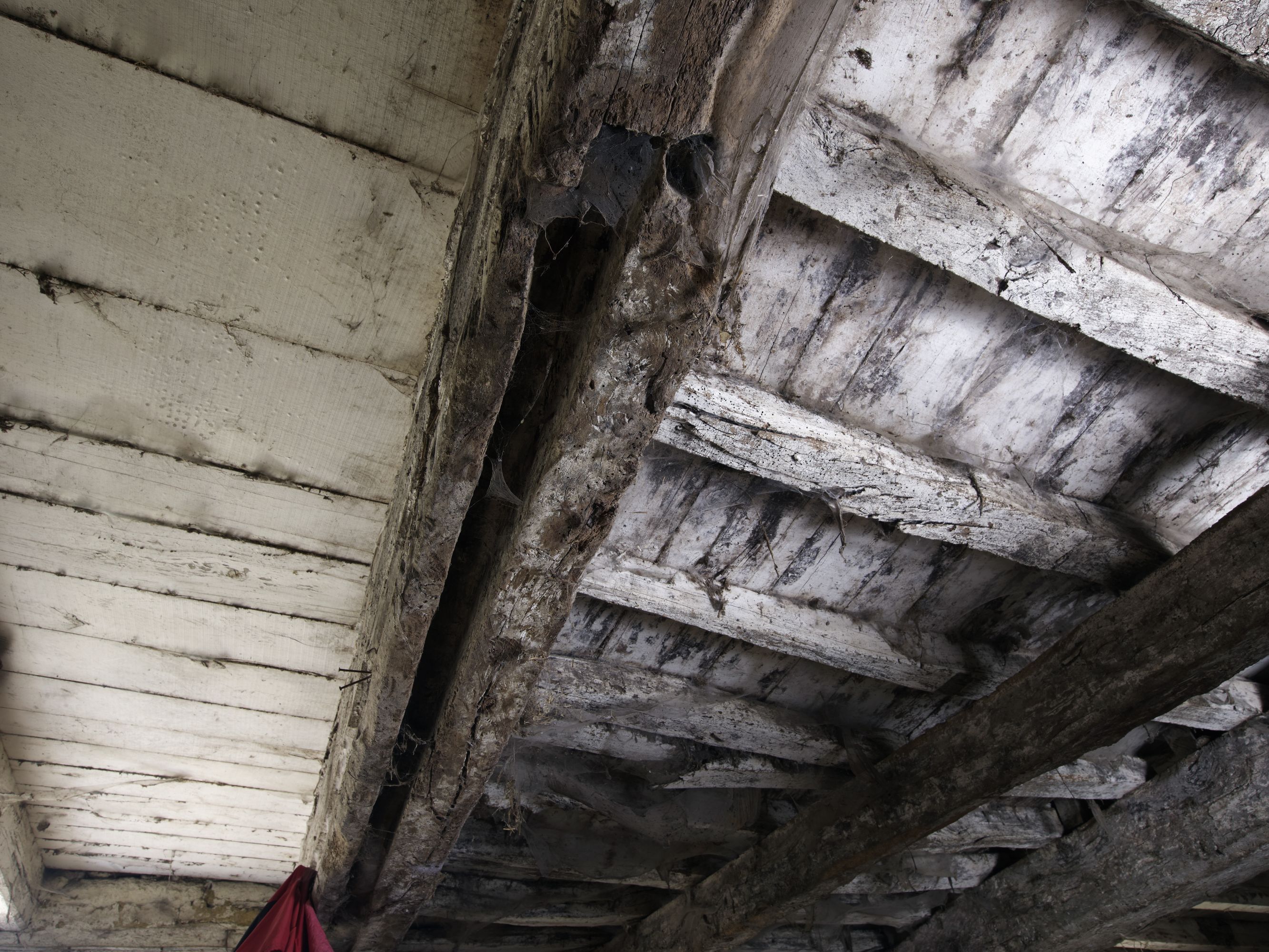 Intérieur du logis-étable, détail de la poutre dans laquelle sont fixés les palisImmatriculation