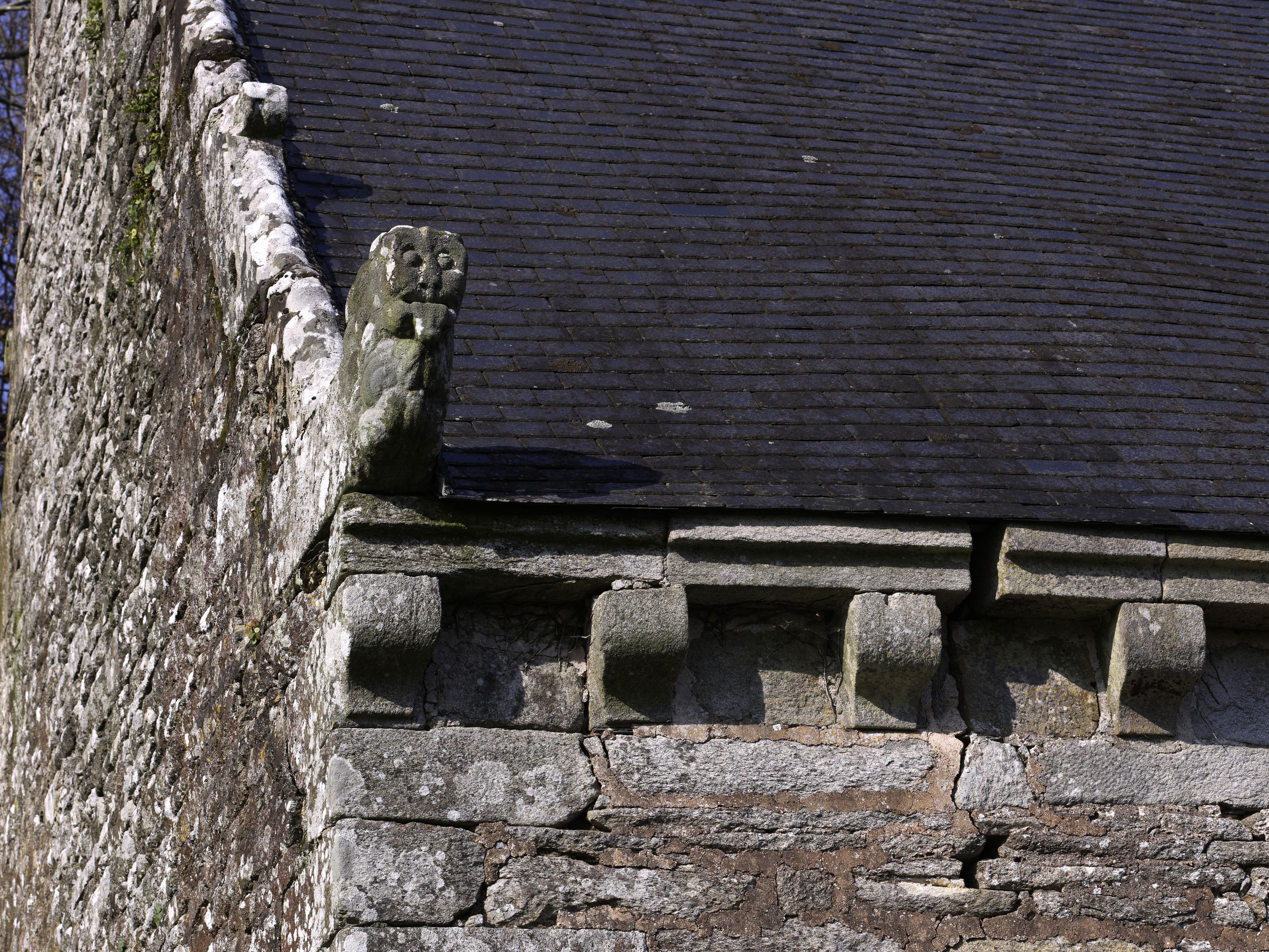Extérieur de la chapelle, vue du décor et du rampant sculpté (personnage tirant la langue)Immatriculation
