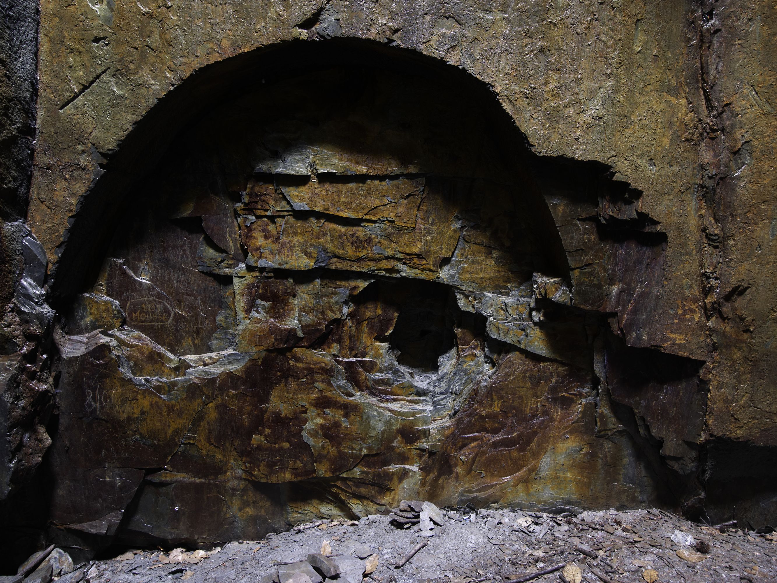 Ardoisière du Pont de l'Église : galerie souterraine, taille en voûteImmatriculation