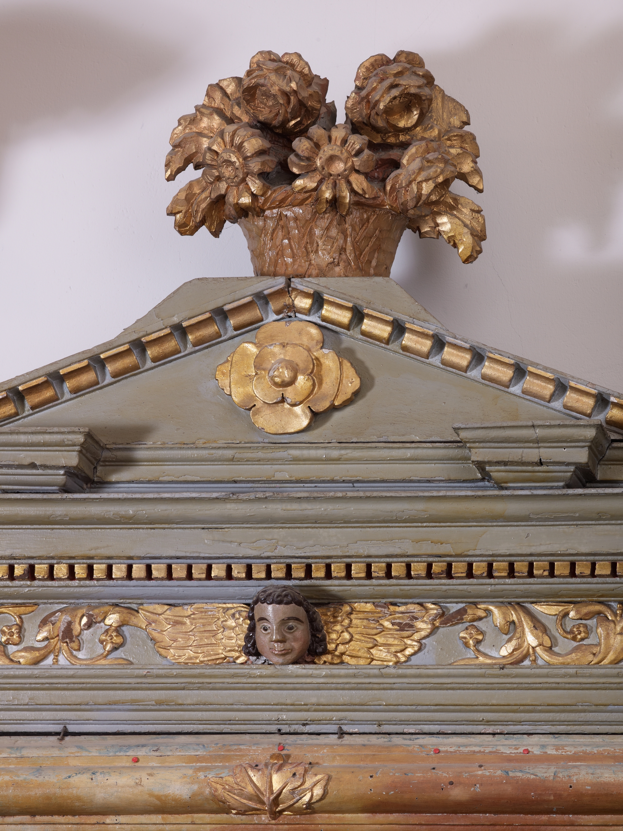 Ensemble de l'autel-retable du Rosaire : décor de la partie supérieure du retable (état en 2013)Immatriculation