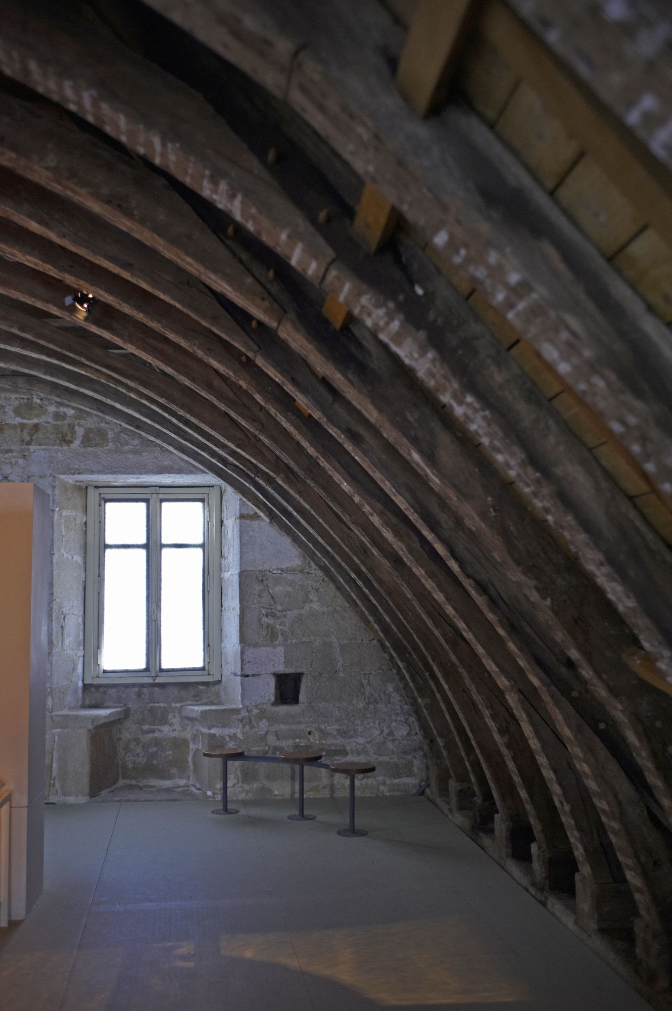 Corps principal, dernier étage, pièce sous charpente, fenêtre nord et charpente en berceau