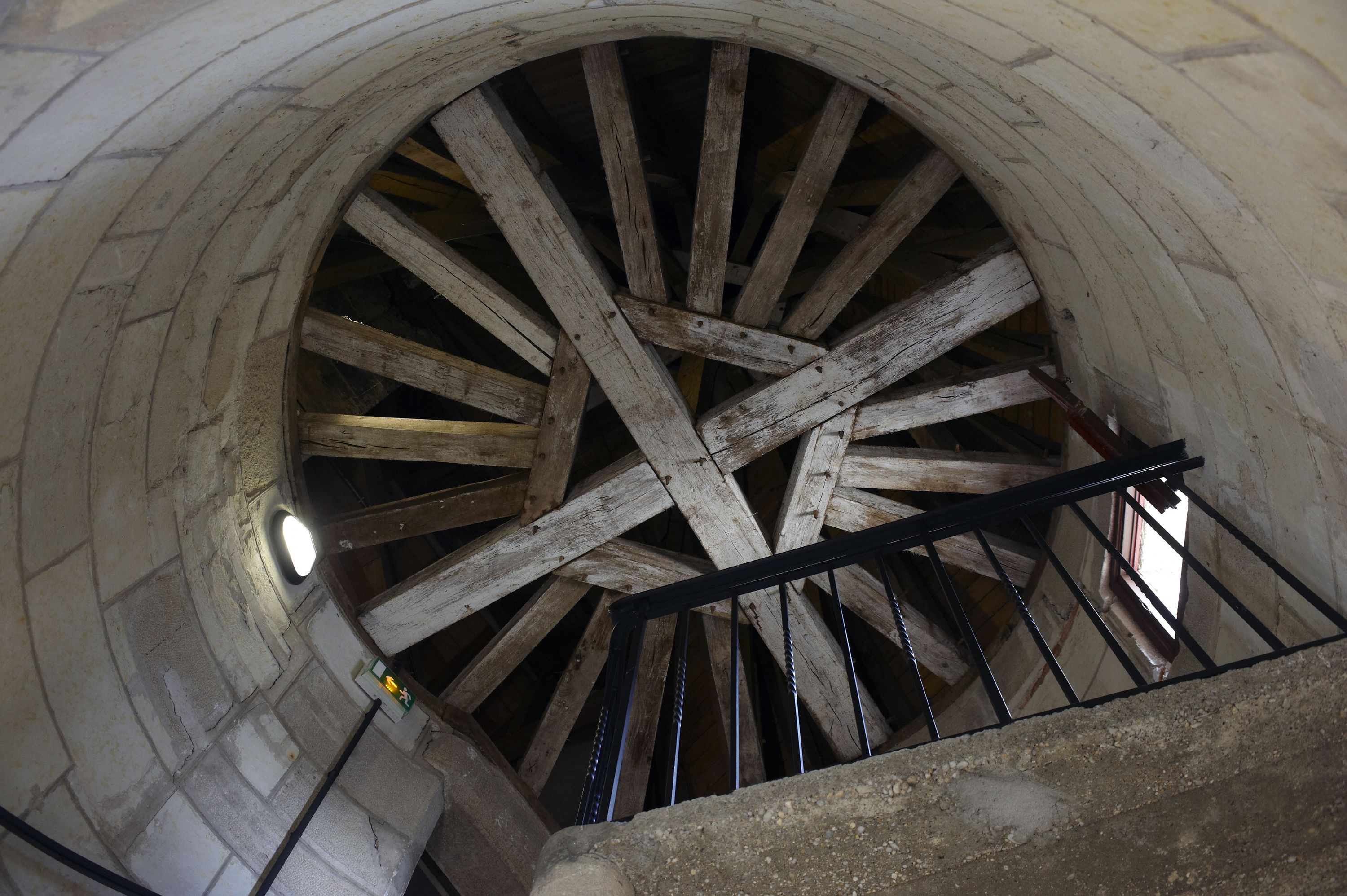 Grand escalier en vis, charpente d'enrayureImmatriculation