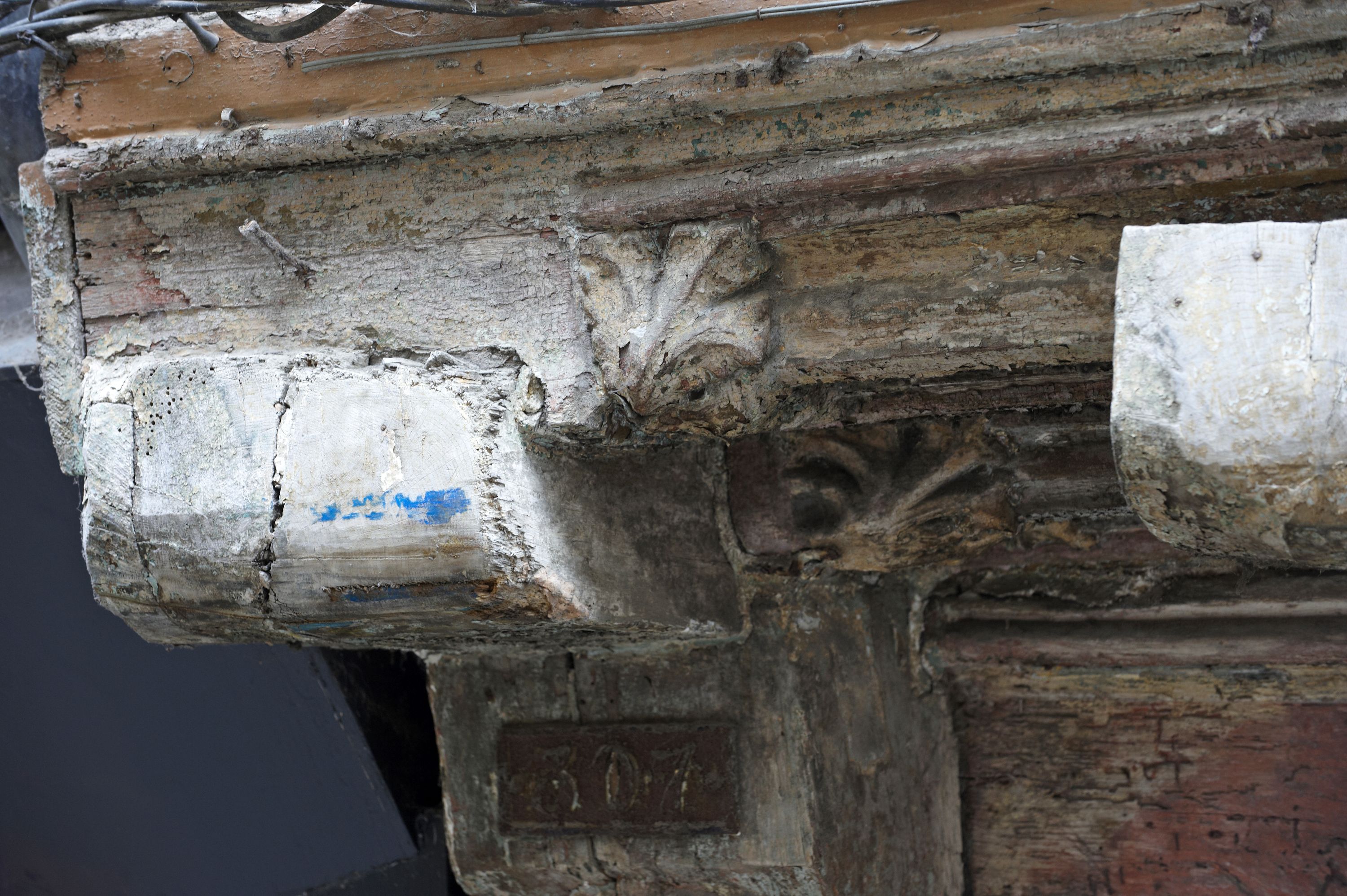 Façade sur rue, encorbellement 1er étage, détail poutre et sablière avec congéImmatriculation