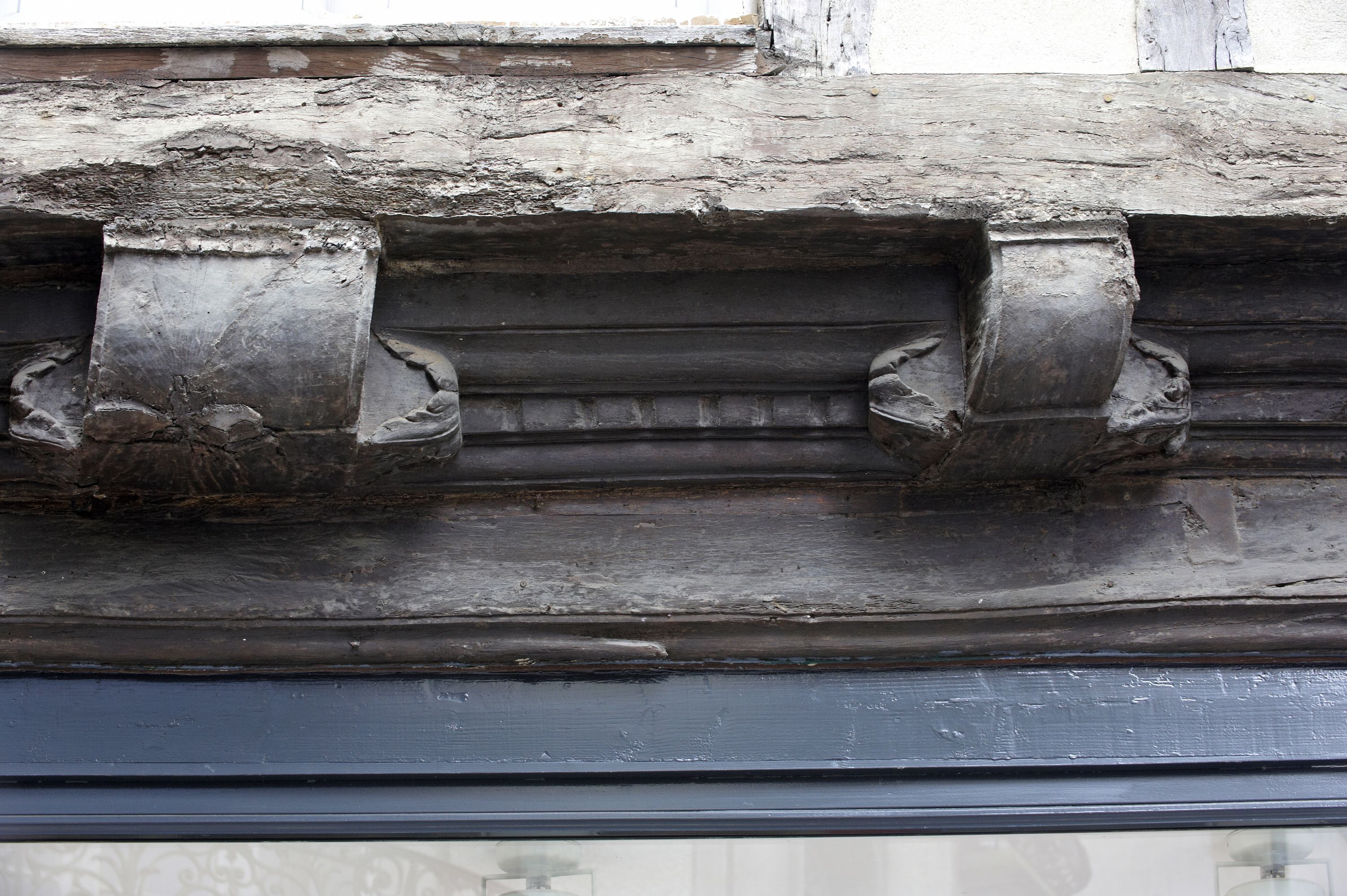 Façade sur rue, encorbellement, premier étage, détailImmatriculation
