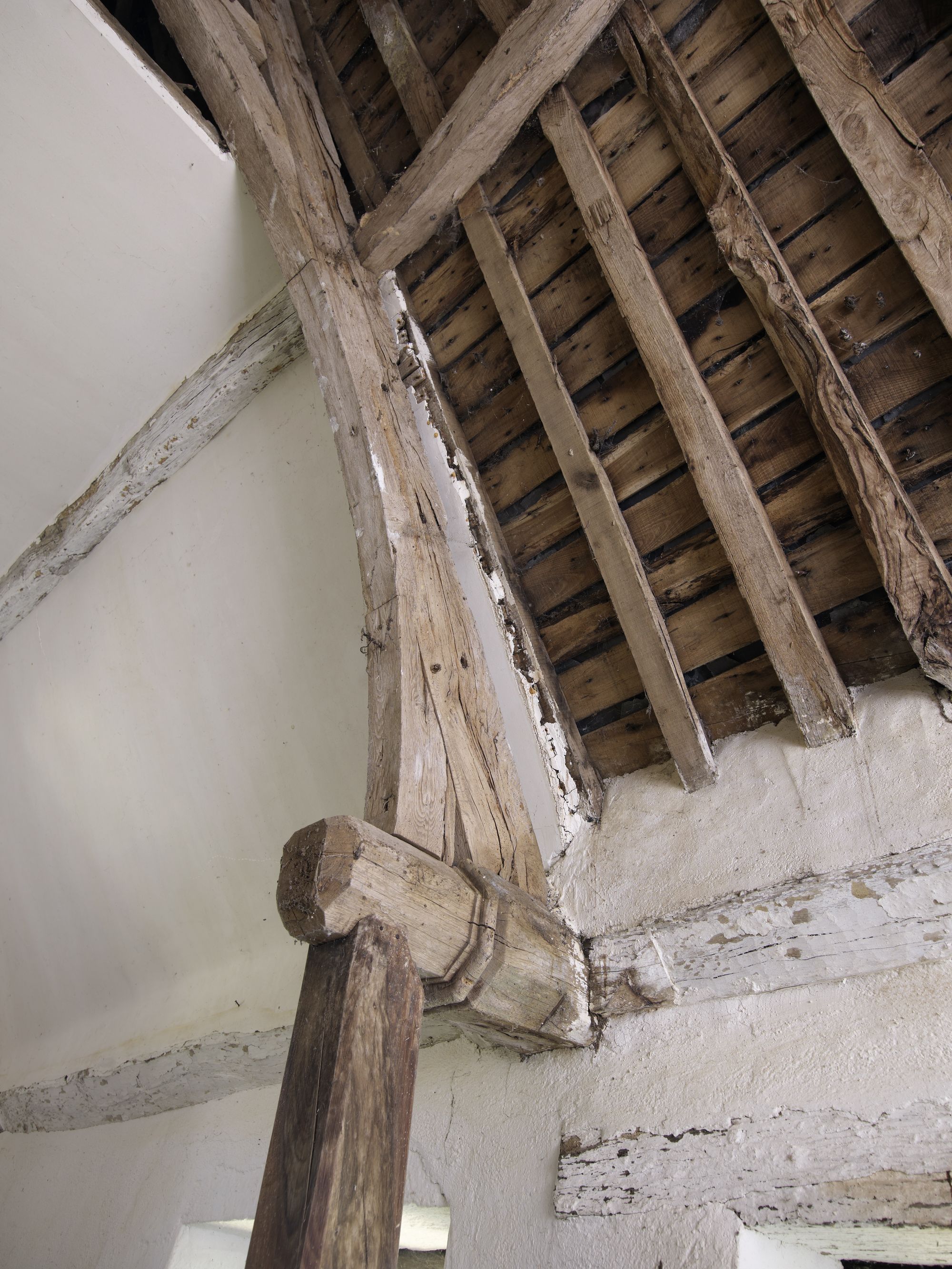 Chapelle, détail de la charpente arbalétrier et jambette courbe reposant sur un entrait coupéImmatriculation