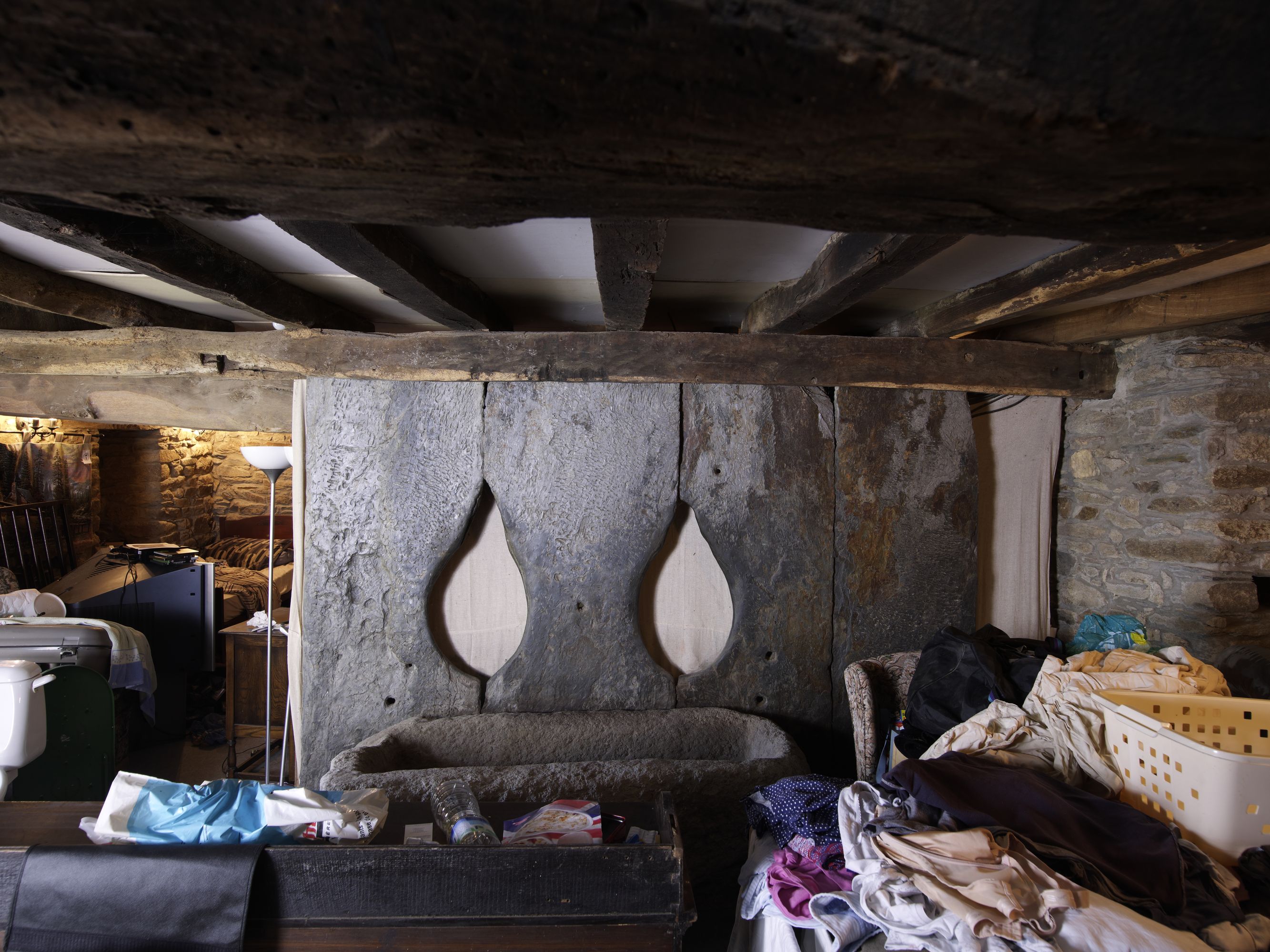 Logis sud, cloison de séparation entre étable et pièce à vivre formée de palis de schiste ajourés pour le passage des têtes de vaches et mangeoireImmatriculation