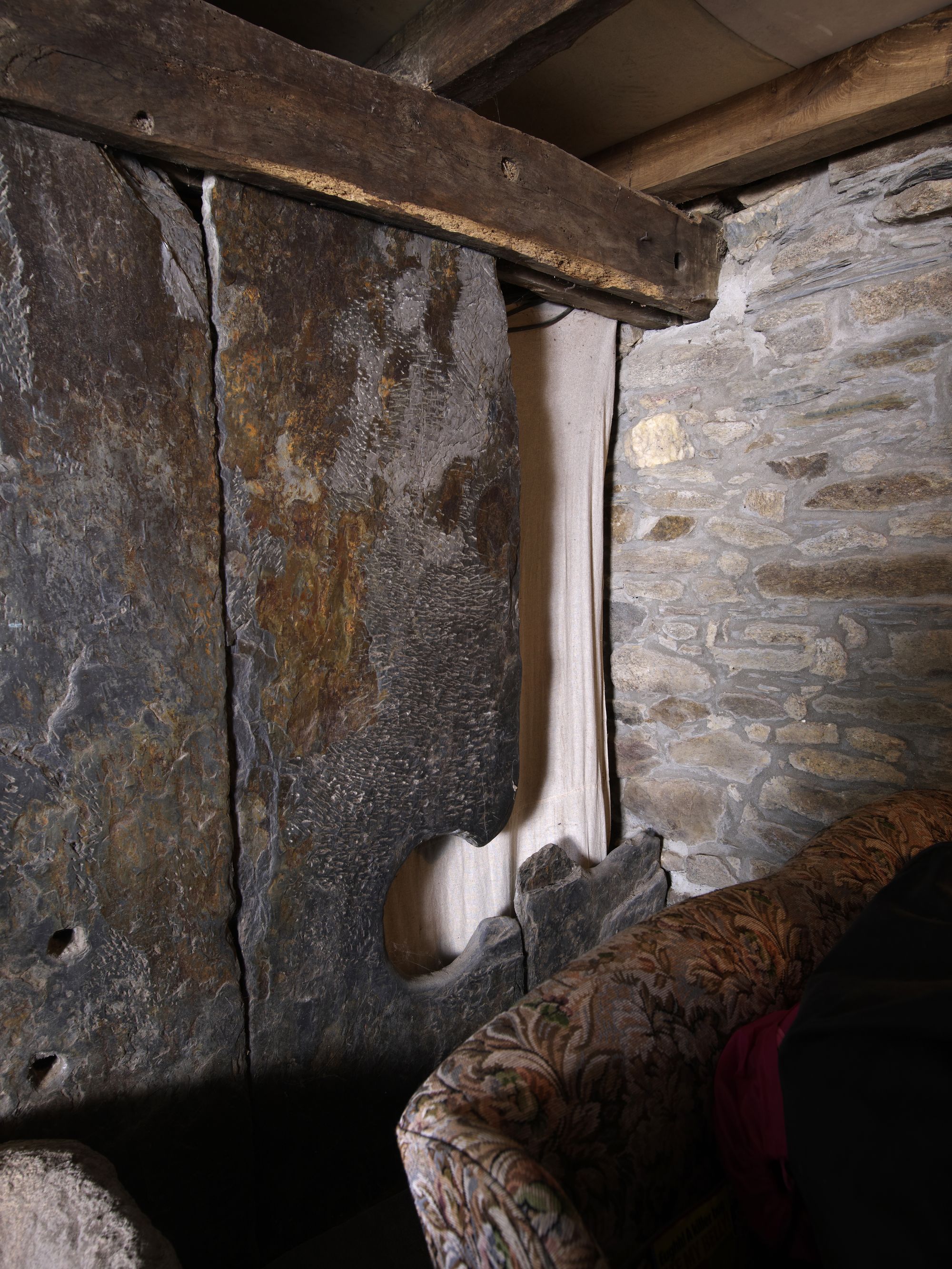 Logis sud, cloison de séparation entre étable et pièce à vivre formée de palis de schiste ajourés, détail du trou plus petit à l'extrémité pour un mouton ou une chèvreImmatriculation