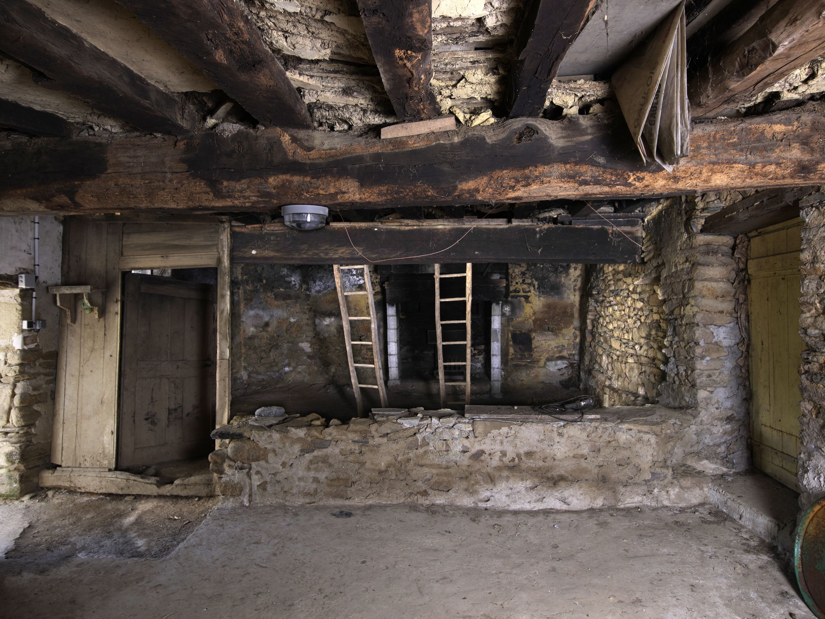 Vue intérieure prise de l'étable vers la salle ferme d'une cloison (partiellement détruite)Immatriculation