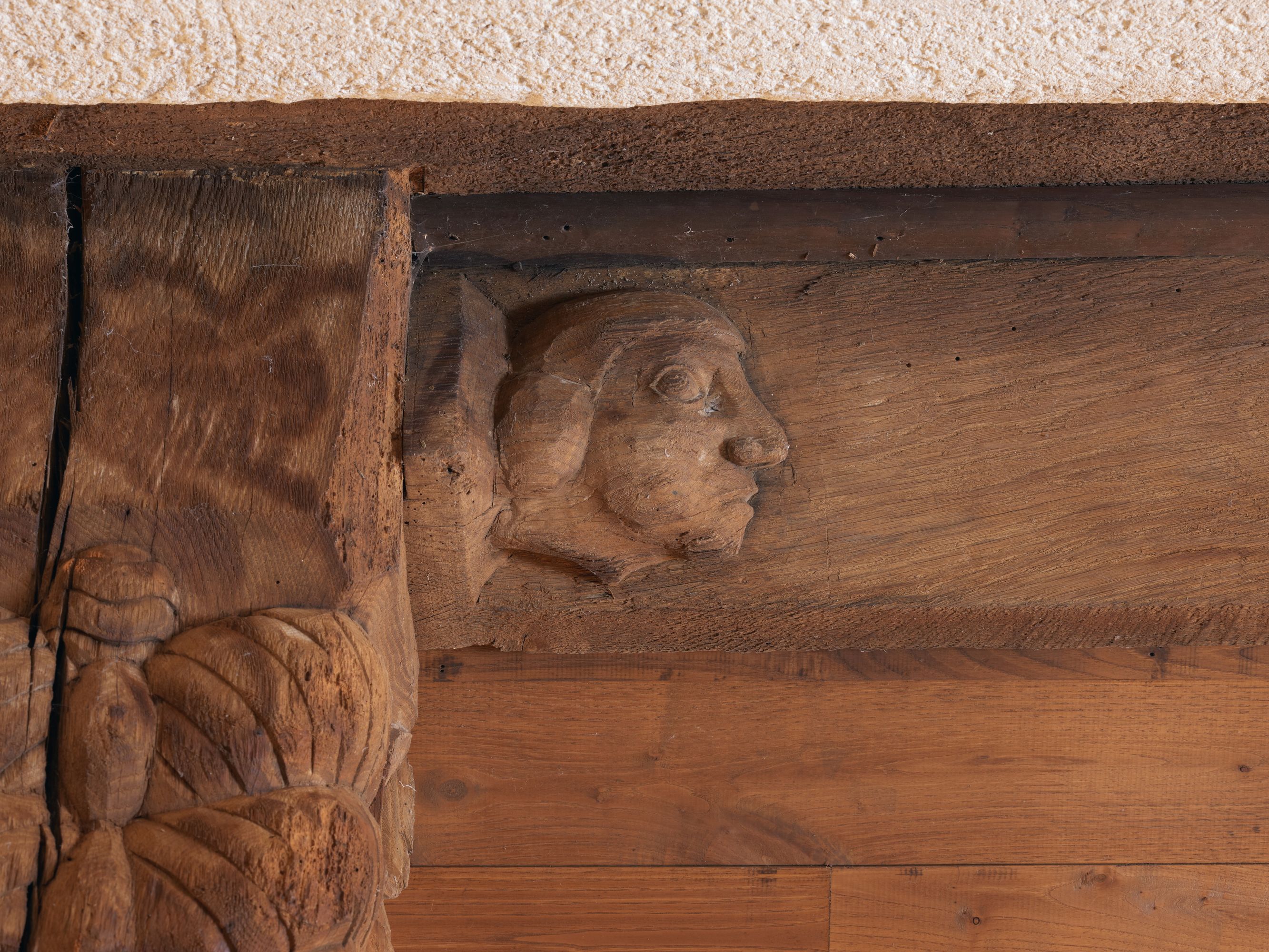 Chapelle, bras nord du transept, mur ouest : visage d'homme sur un départ de sablière (état en 2013)Immatriculation