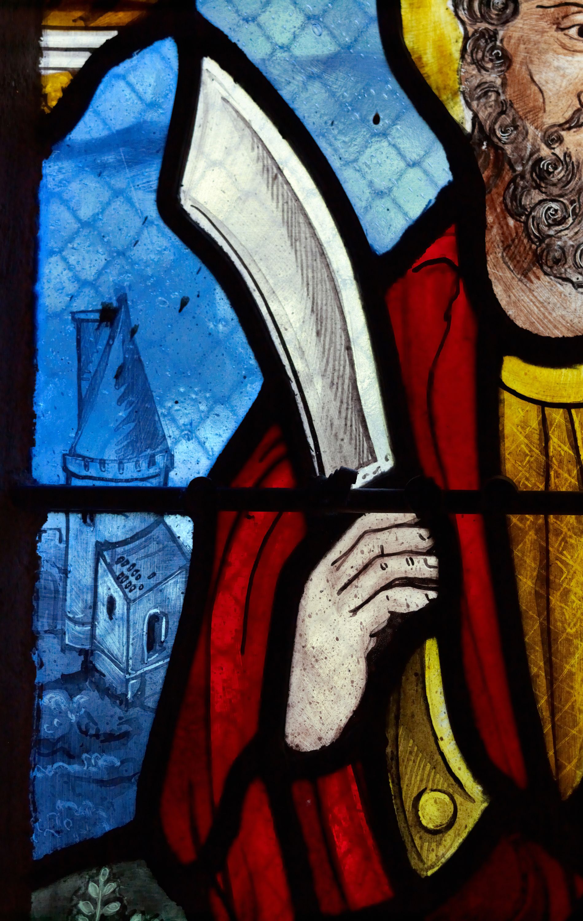 Verrière de la baie 3 : élément d'architecture à la droite de saint Barthélemy (état en 2013)Immatriculation