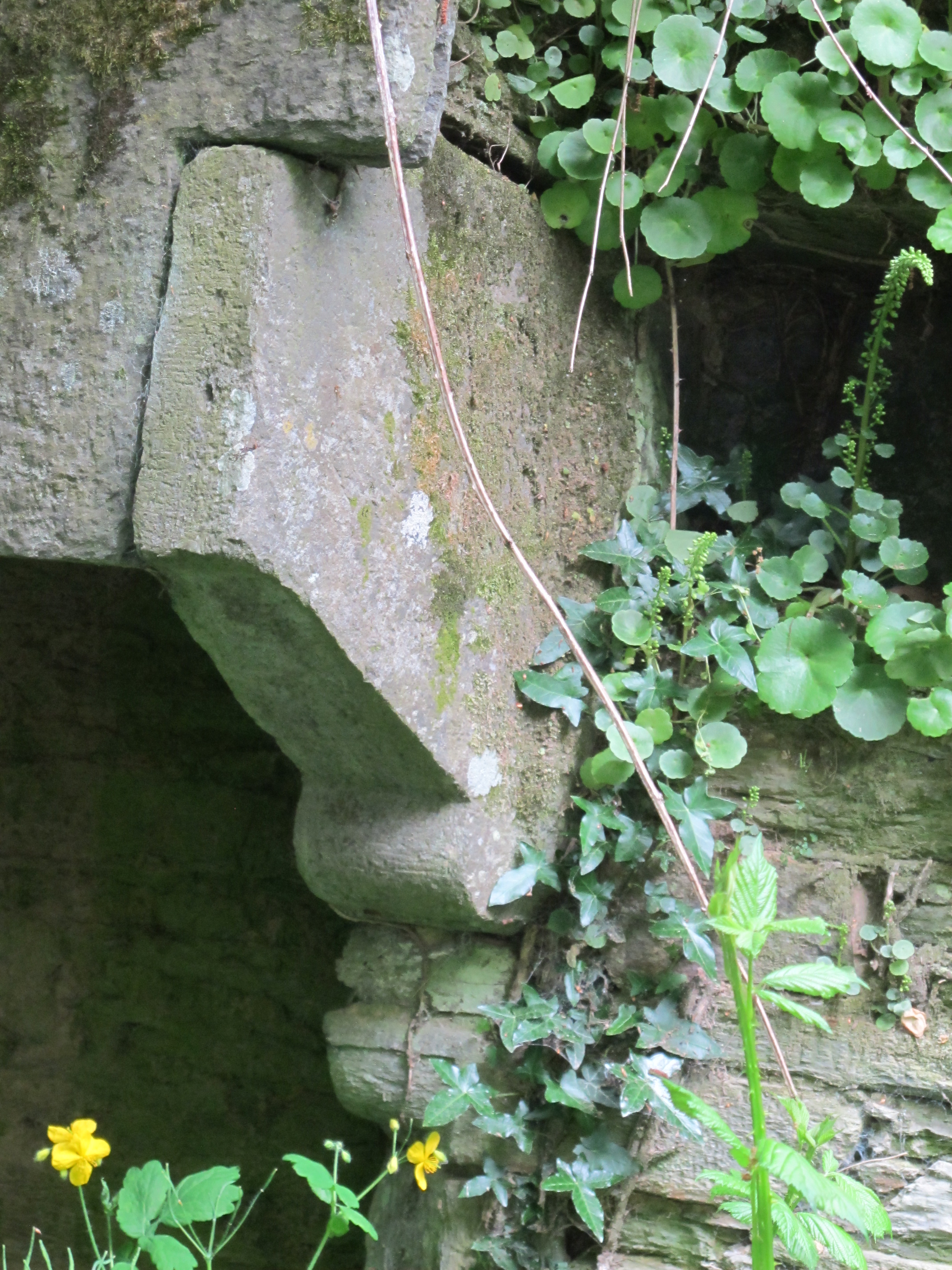 Édifice en ruine 9 : la console droite moulurée qui soutient le linteau de la cheminée (état en 2013)Immatriculation