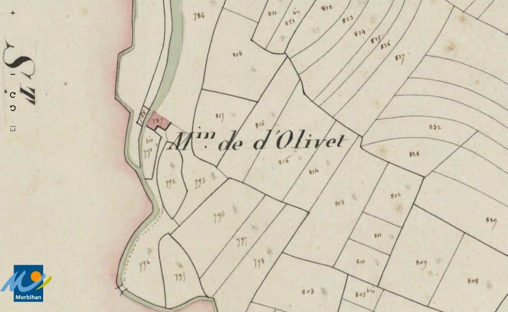 Le moulin à eau de d'Olivet sur le cadastre de 1829 (A. D. du Morbihan, 3 P 75/3)Immatriculation
