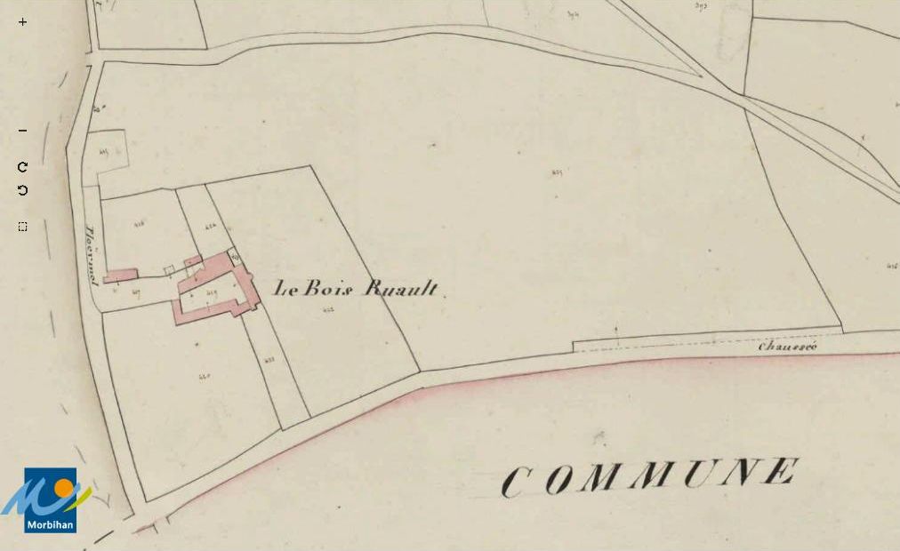Le manoir du Bois-Ruault sur le cadastre de 1829 (A. D. du Morbihan, 3 P 75/7)Immatriculation