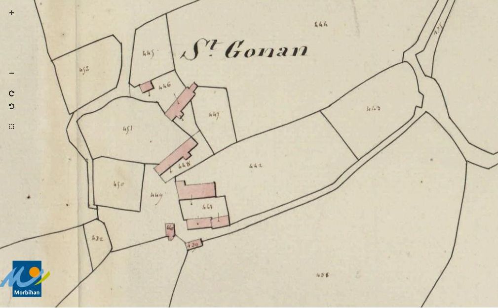 Le manoir de Saint-Gonan sur le cadastre de 1829 (A. D. du Morbihan, 3 P 75/7)Immatriculation