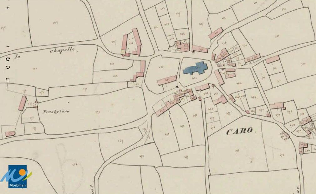 Le bourg de Caro sur le cadastre de 1829 (A. D. du Morbihan, 3 P 75/11). à l'ouest, sous le presbytère tout en longueur, est dessinée la chapelle Saint-NicolasImmatriculation