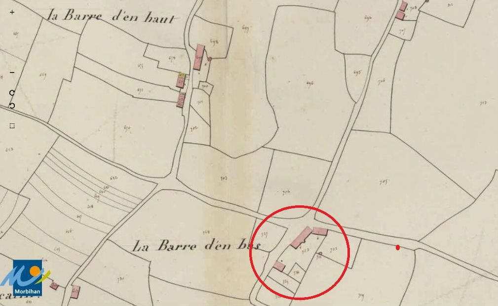 Le manoir de la Barre d'en bas sur le cadastre de 1829 (A. D. du Morbihan, 3 P 75/3)Immatriculation