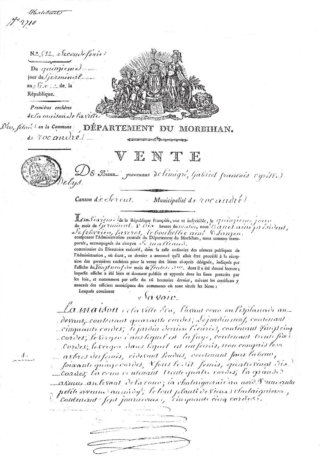Acte de vente au titre des biens nationaux, daté de l'an VI (A. D. du Morbihan)Immatriculation