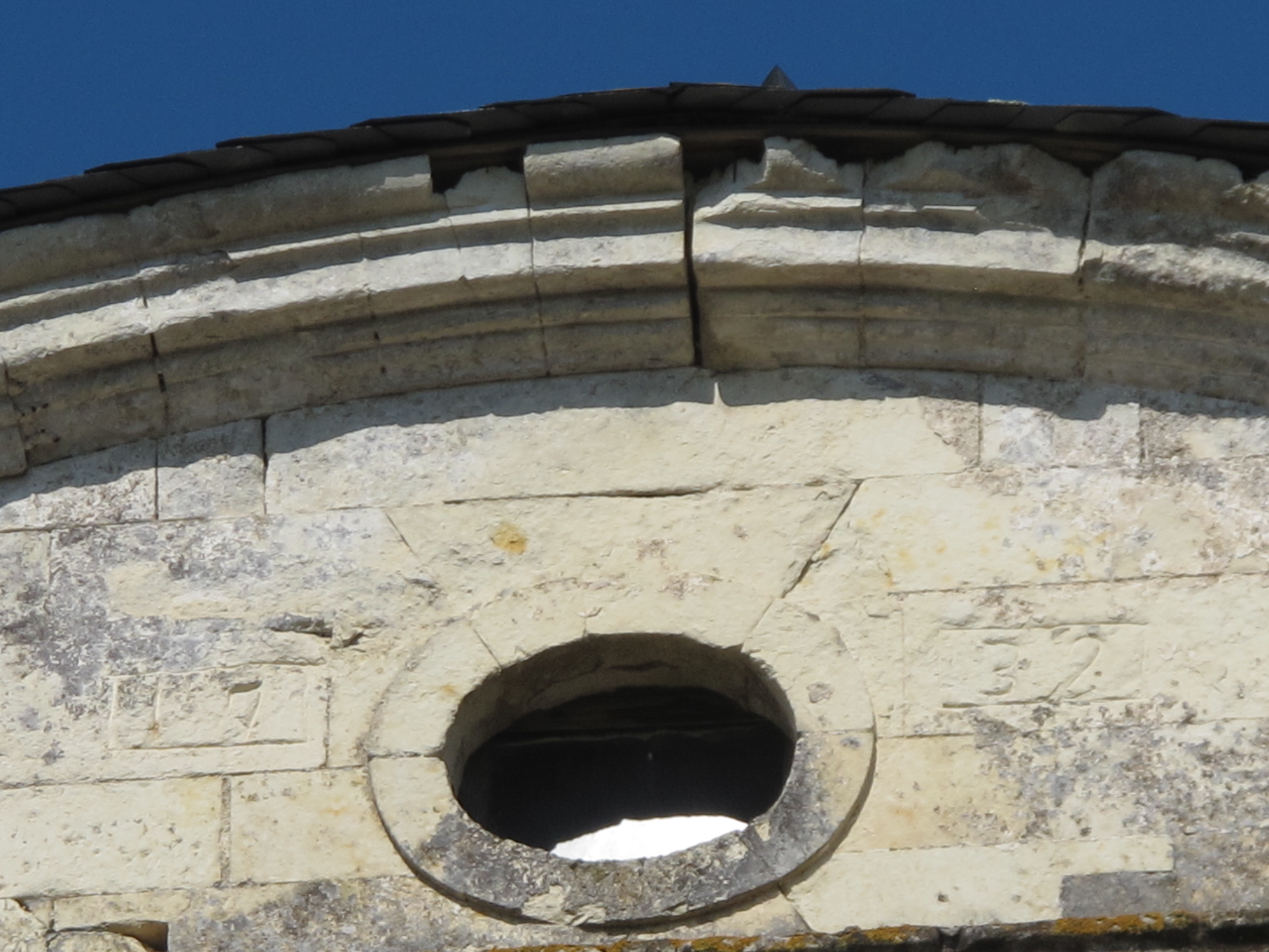 Château, corps central : la date 1732 gravée de part et d'autre de l'œil de bœuf (état en 2013)Immatriculation