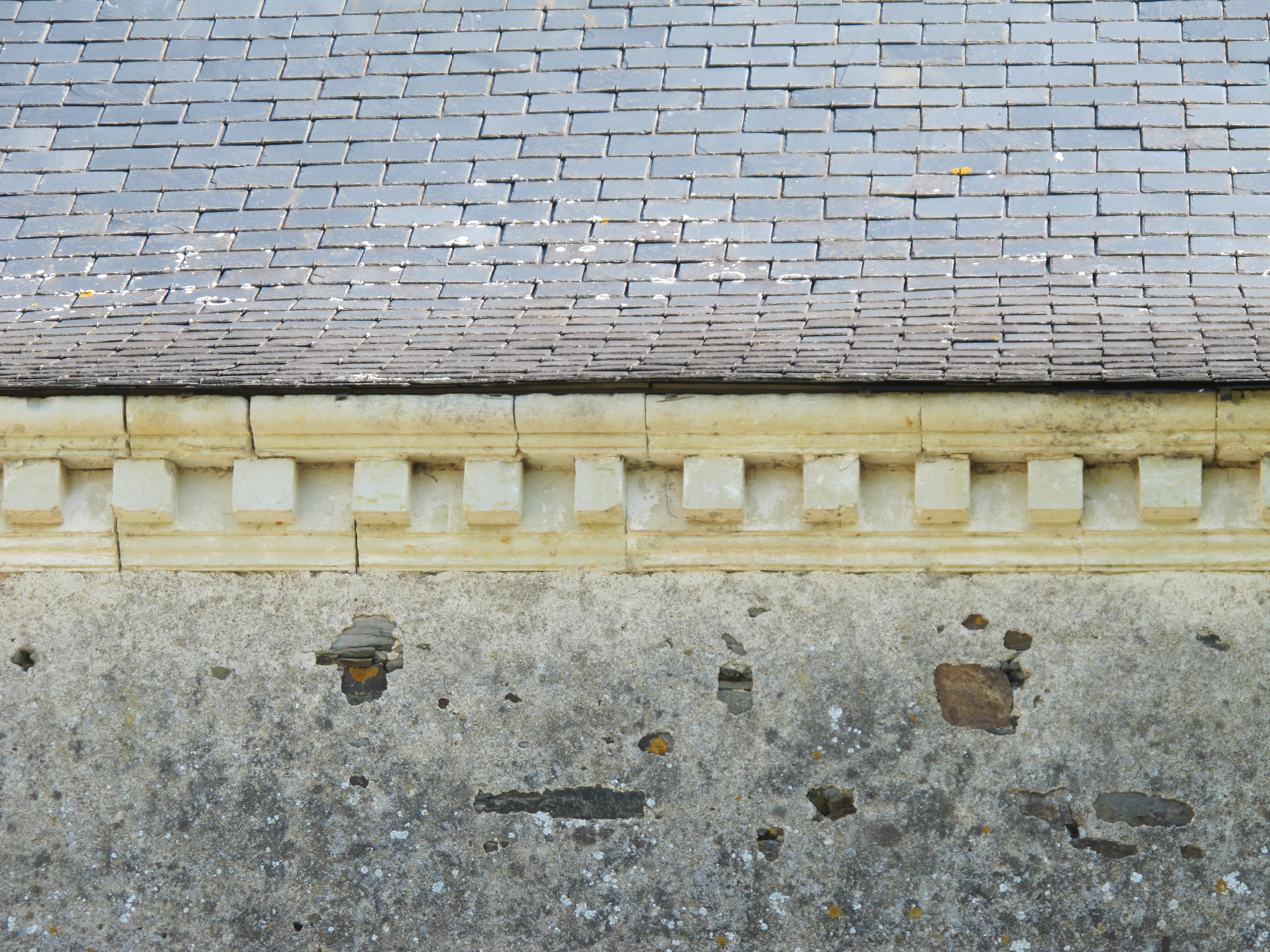 Château, communs : corniche à modillons du mur sud (état en 2013)Immatriculation