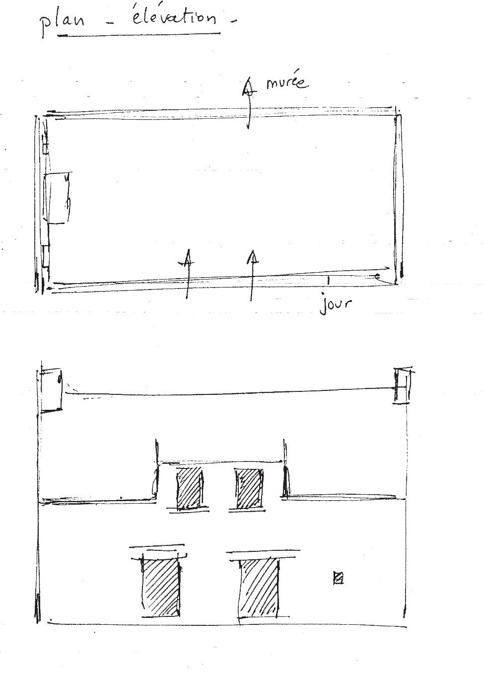 Maison : plan au sol du rez-de-chaussée et élévation sud (schéma réalisé en 1983 par J. P. Ducouret)Immatriculation