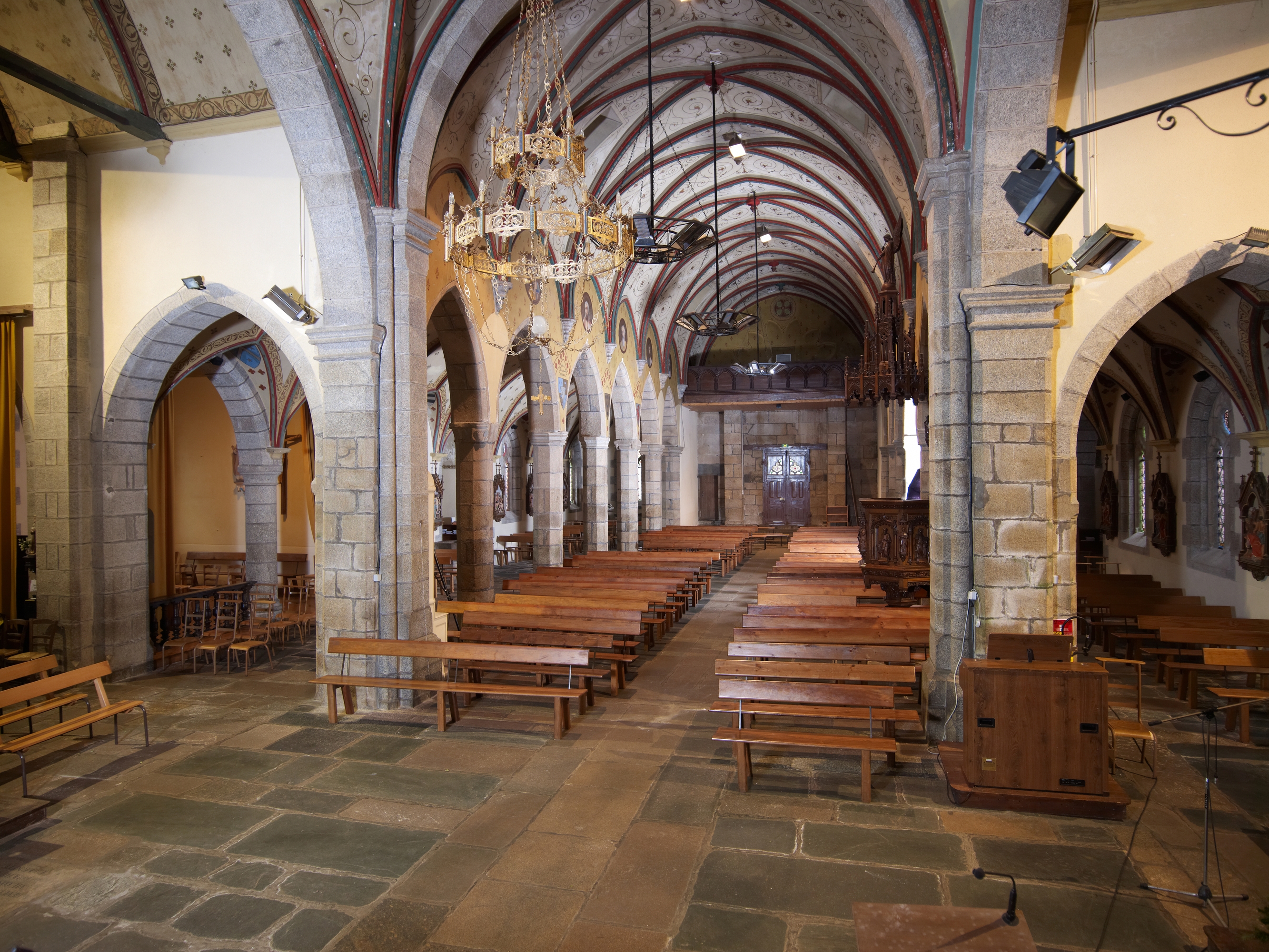 Ploubezre : église paroissiale, vue intérieure, la nef et les bas-côtés depuis le chœurImmatriculation