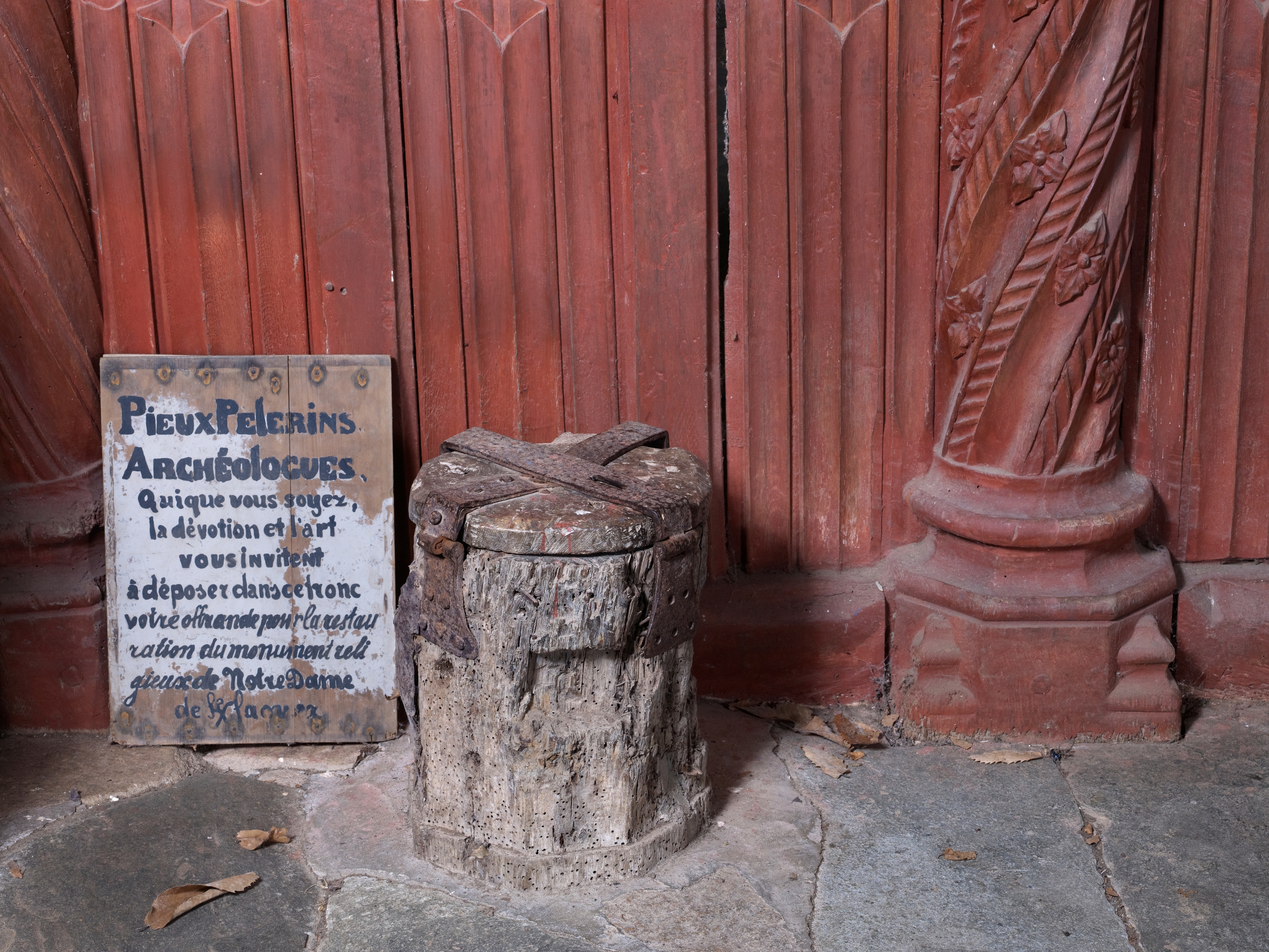Ploubezre, chapelle de Kerfons : vue intérieure, ancien tronc et sa signalétiqueImmatriculation