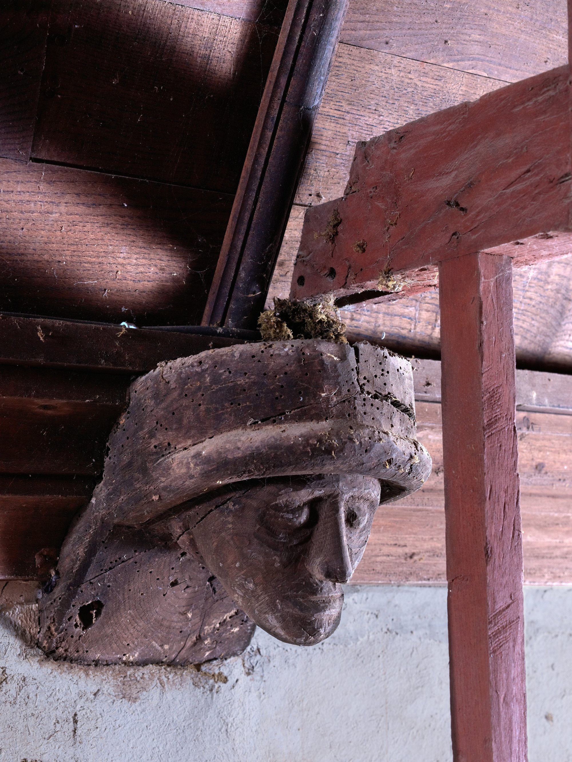 Ploubezre, chapelle de Kerfons : vue intérieure, blochet sculpté vraisemblablement datable de la fin du 14e siècleImmatriculation