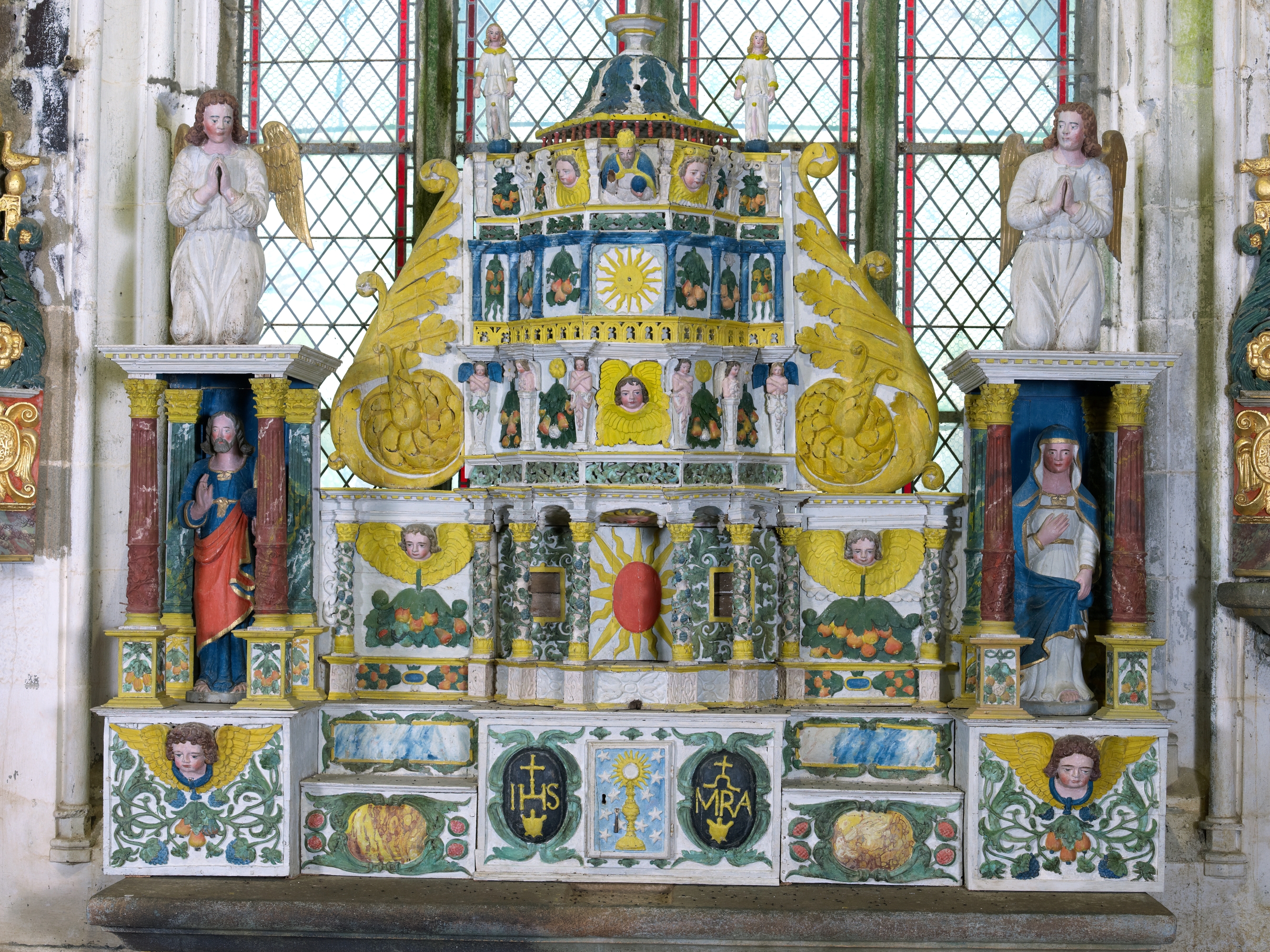 Ploubezre, chapelle de Kerfons : vue intérieure, retable du maître-autel du 17e siècle. Ses niches latérales, ornées de colonnettes, abritent des statues du Christ et de la ViergeImmatriculation