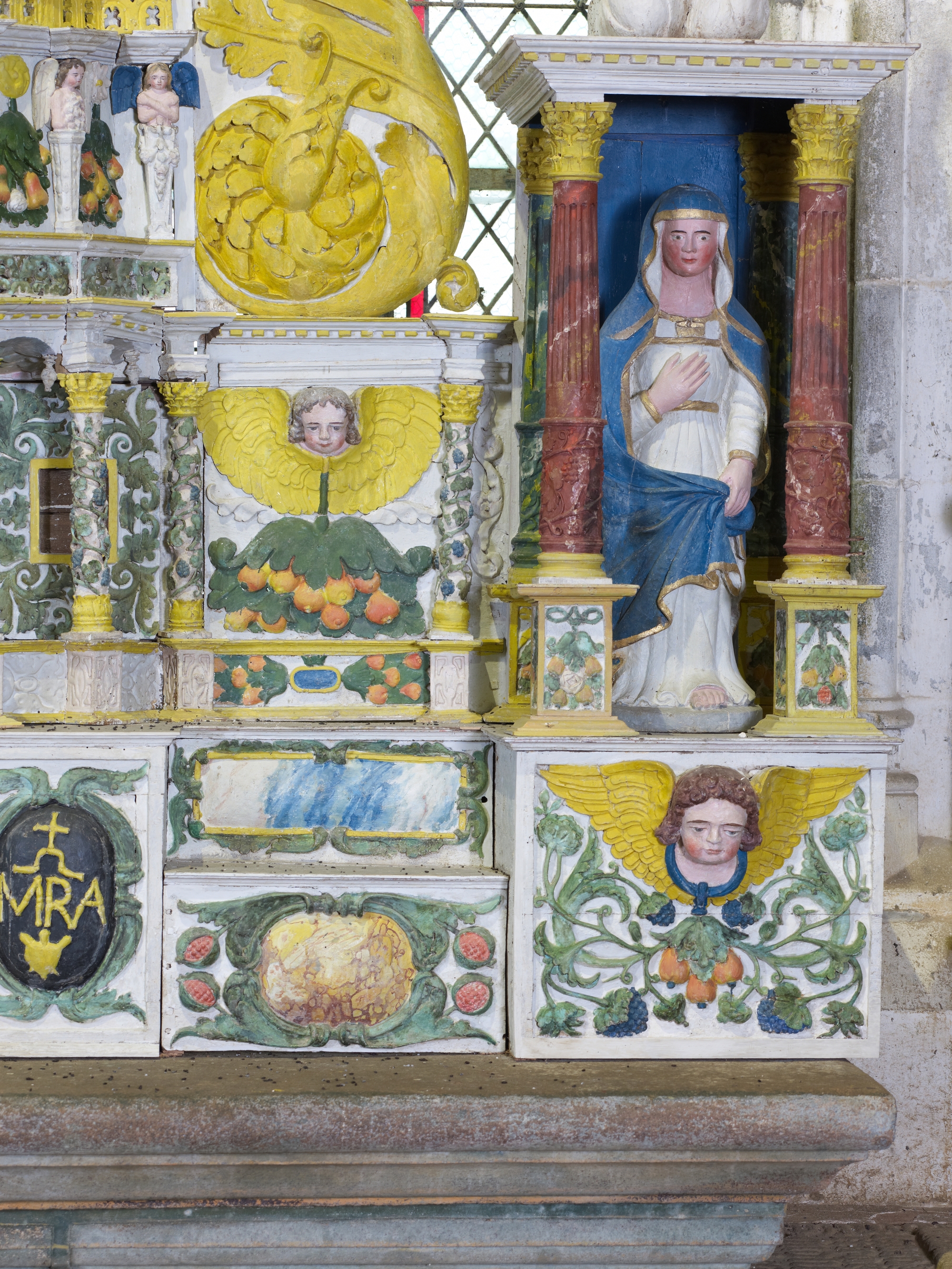 Ploubezre, chapelle de Kerfons : vue intérieure, détail du retable du maître-autel du 17e siècle. Ses niches latérales, ornées de colonnettes, abritent des statues du Christ et de la ViergeImmatriculation