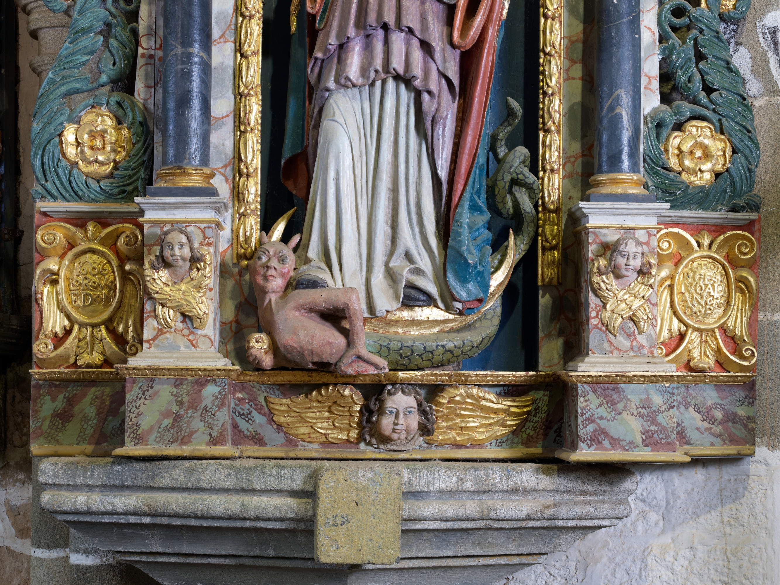 Ploubezre, chapelle de Kerfons : vue intérieure, statue de la Vierge à l'enfant terrassant le dragon. On peut lire l'inscription suivante : "1686 L[ORS] R[ECTEUR] V[ÉNÉRABLE] E[T] D[ISCRET] M[ESSIRE] GEORGE RIVOALLAN R[ECTEUR] D[E] P[LOUBEZRE]"Immatriculation