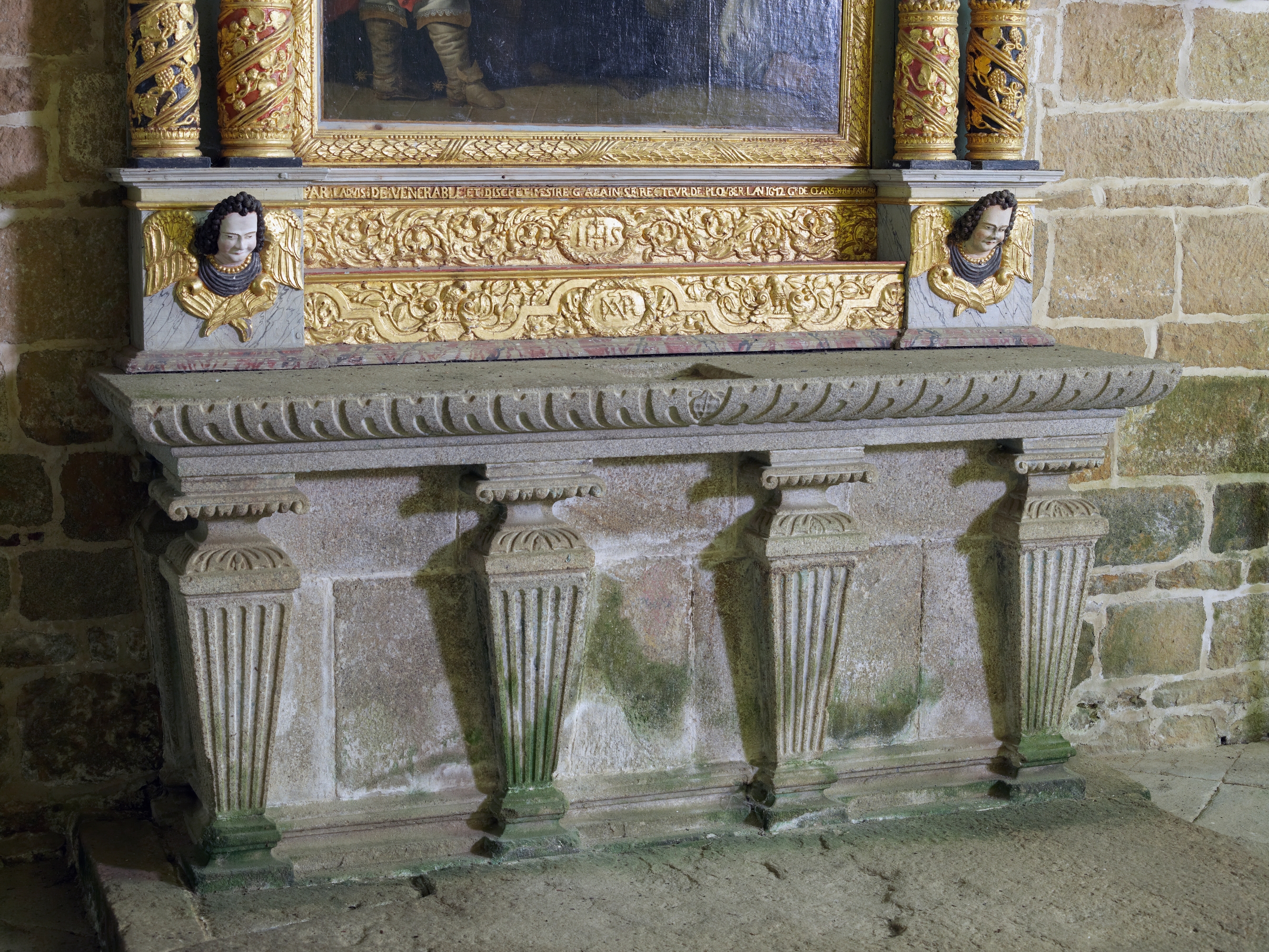 Ploubezre, chapelle de Kerfons : vue intérieure, détail du retable de la chapelle latérale sud. On peut lire l'inscription : "F(AIT) PAR L ADVIS DE VÉNÉRABLE ET DISCRET MESIRE G. ALAIN Sr RECTEUR DE PLOUBER L'AN 1612. Gr DE CEANS H. H. F. PRIGANT"Immatriculation
