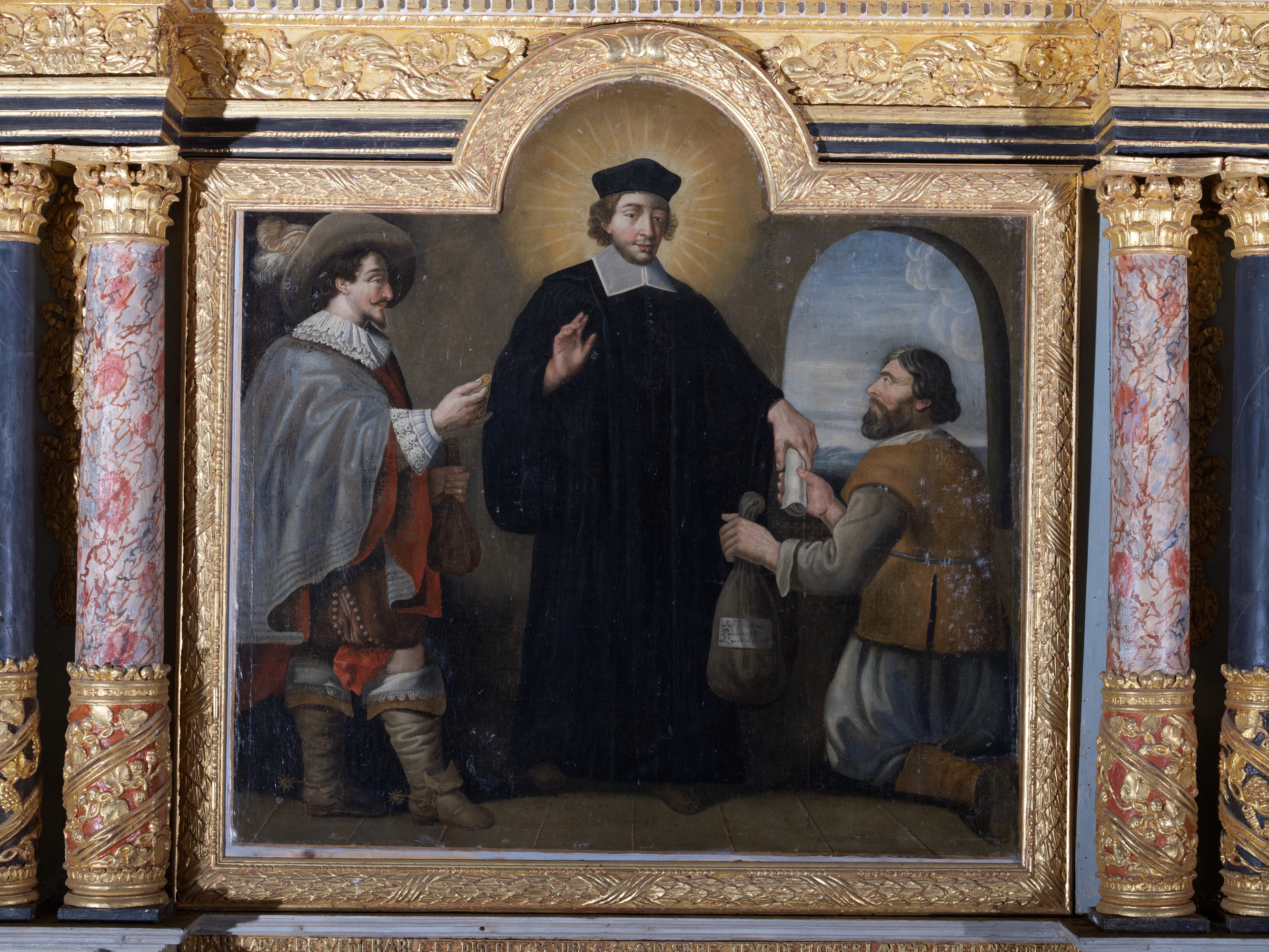 Ploubezre, chapelle de Kerfons : vue intérieure, détail du retable de la chapelle latérale sud. Le panneau peint représente saint Yves entre le riche et le pauvre. Sur la besace du pauvre, on peut lire l'inscription suivante : "Fut pour les pauvres M. Saint Yves avocat"Immatriculation