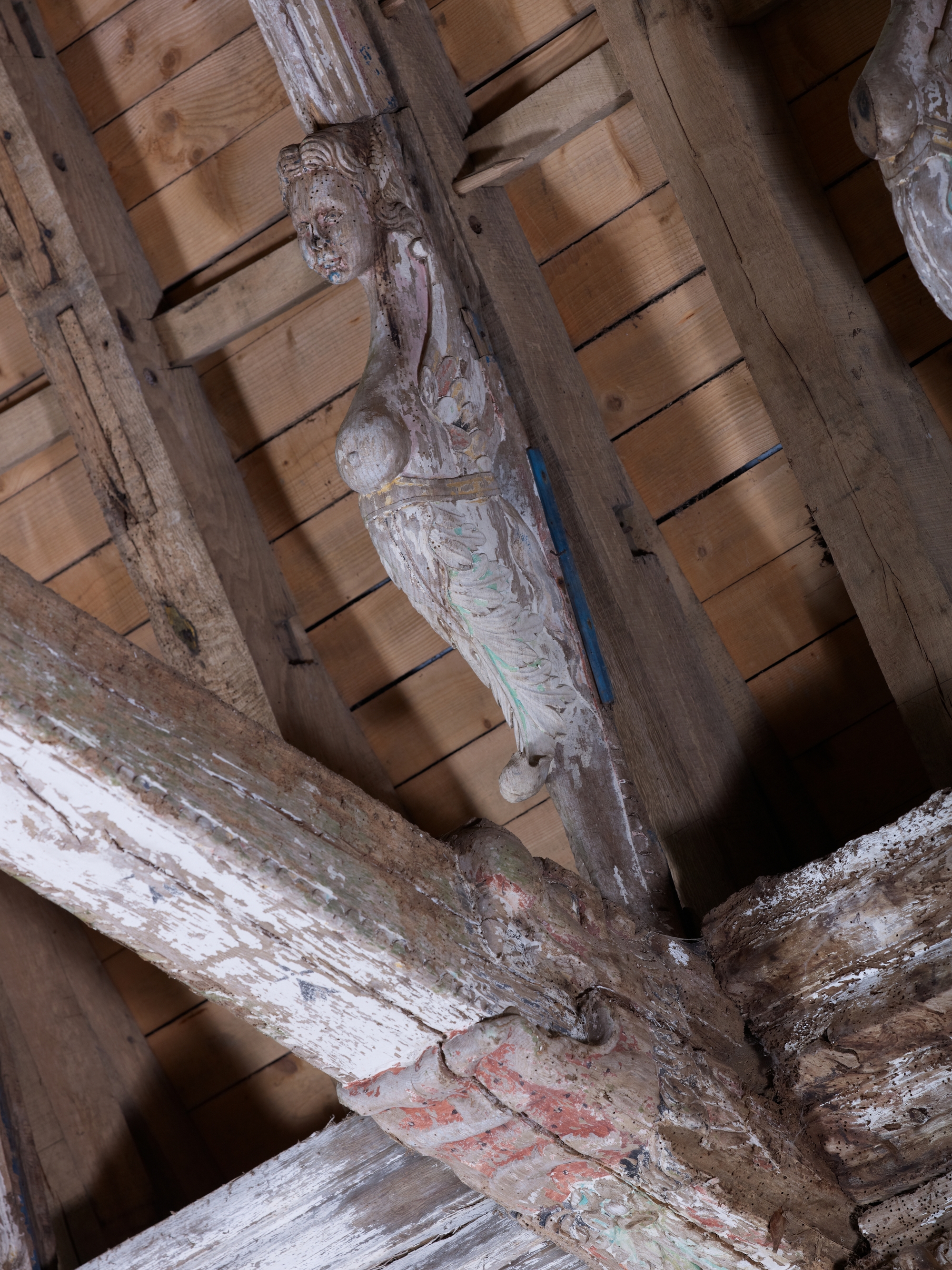 Ploubezre, chapelle de Kerfons : vue intérieure, cerce sculptée en cariatideImmatriculation