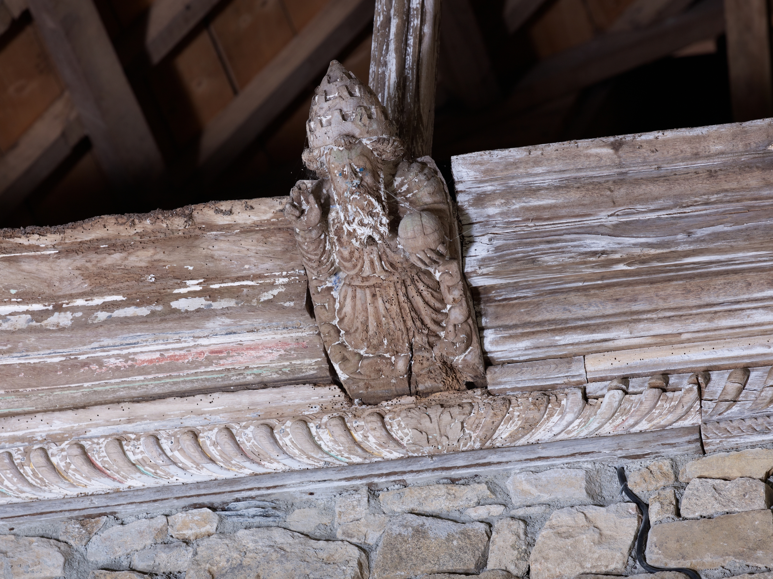 Ploubezre, chapelle de Kerfons : vue intérieure, sablière et blochet sculptésImmatriculation