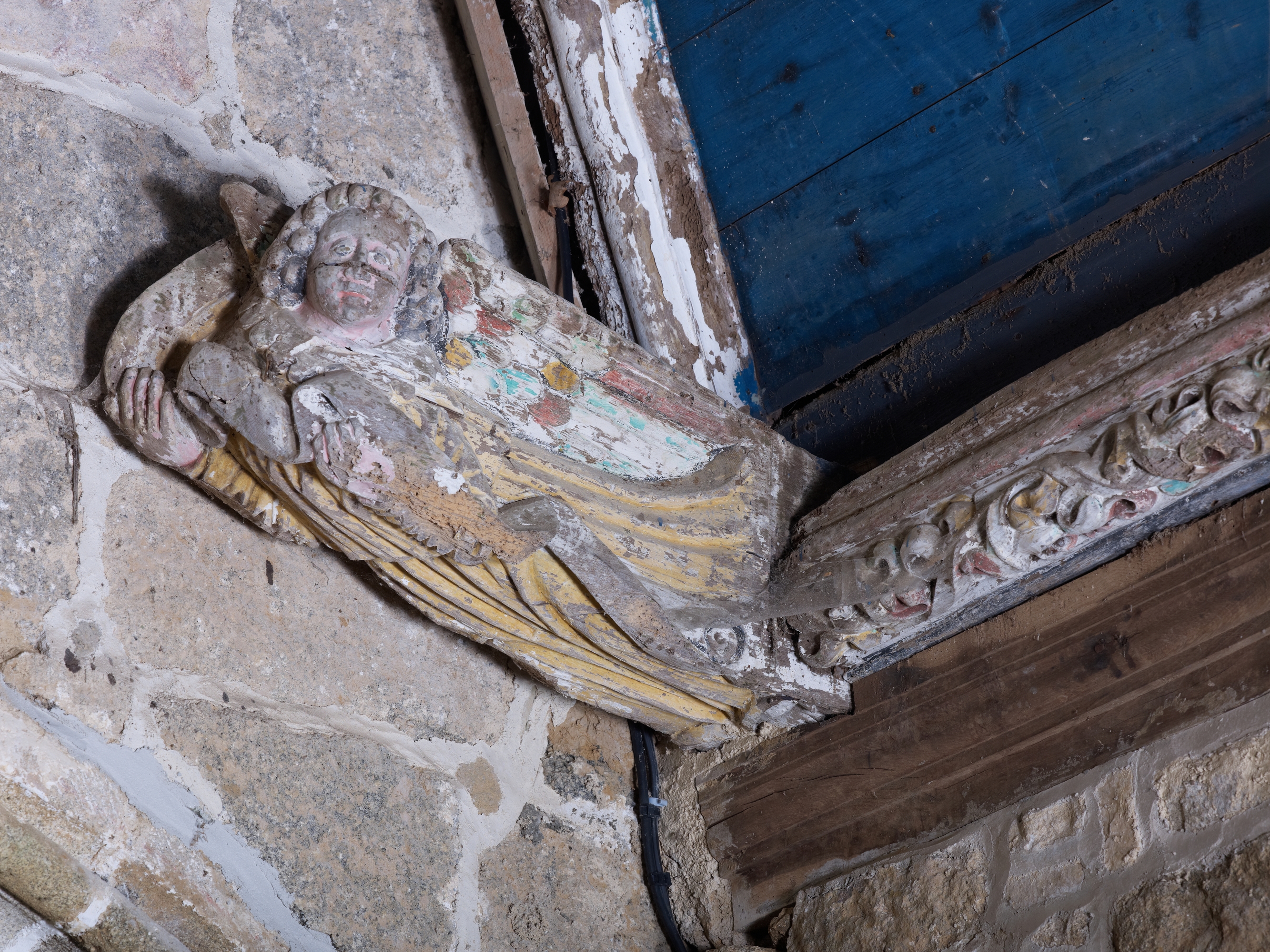 Ploubezre, chapelle de Kerfons : vue intérieure, sablière et blochet sculptésImmatriculation