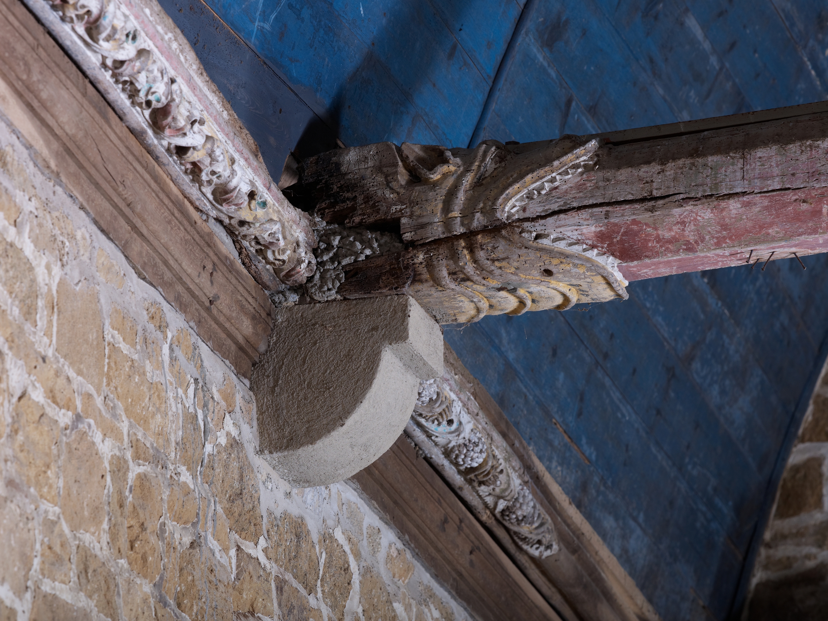 Ploubezre, chapelle de Kerfons : vue intérieure, entrait et engoulant sculptésImmatriculation