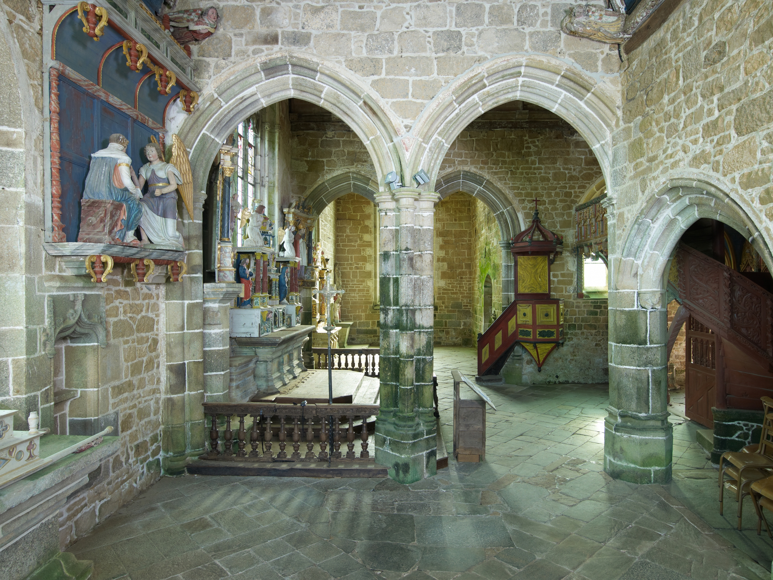 Ploubezre, chapelle de Kerfons : vue intérieure, chapelle latérale nord, arcades en arc brisé et nef. A gauche : groupe sculpté de l'AnnonciationImmatriculation