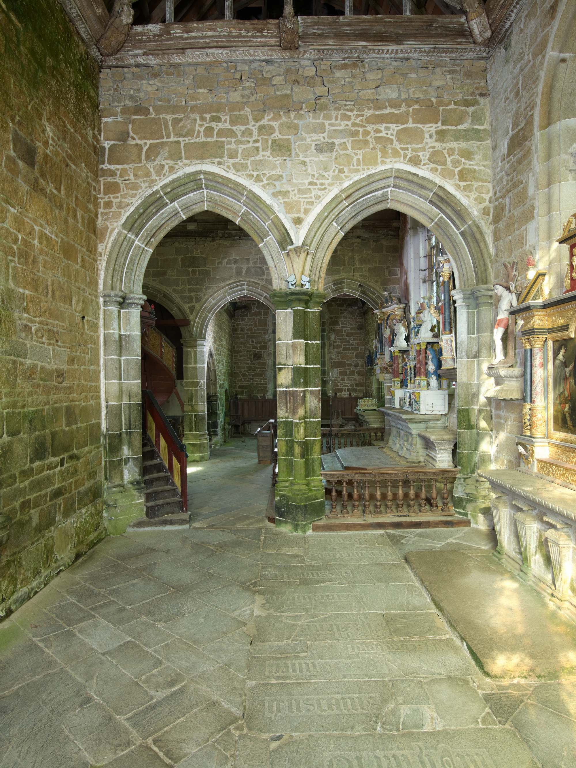 Ploubezre, chapelle de Kerfons : vue intérieure, chapelle latérale sud, arcades en arc brisé et nef. A droite, retable daté 1612Immatriculation