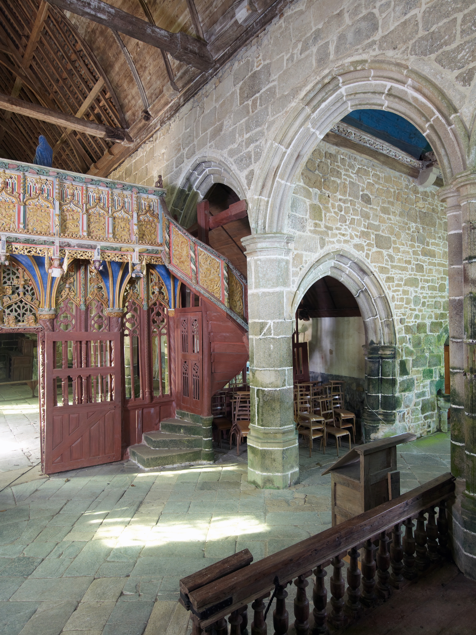 Ploubezre, chapelle de Kerfons : vue intérieure, arcades en arc brisé de la nef et chapelle latérale nord. On distingue l'escalier d'accès à la tribune du jubéImmatriculation