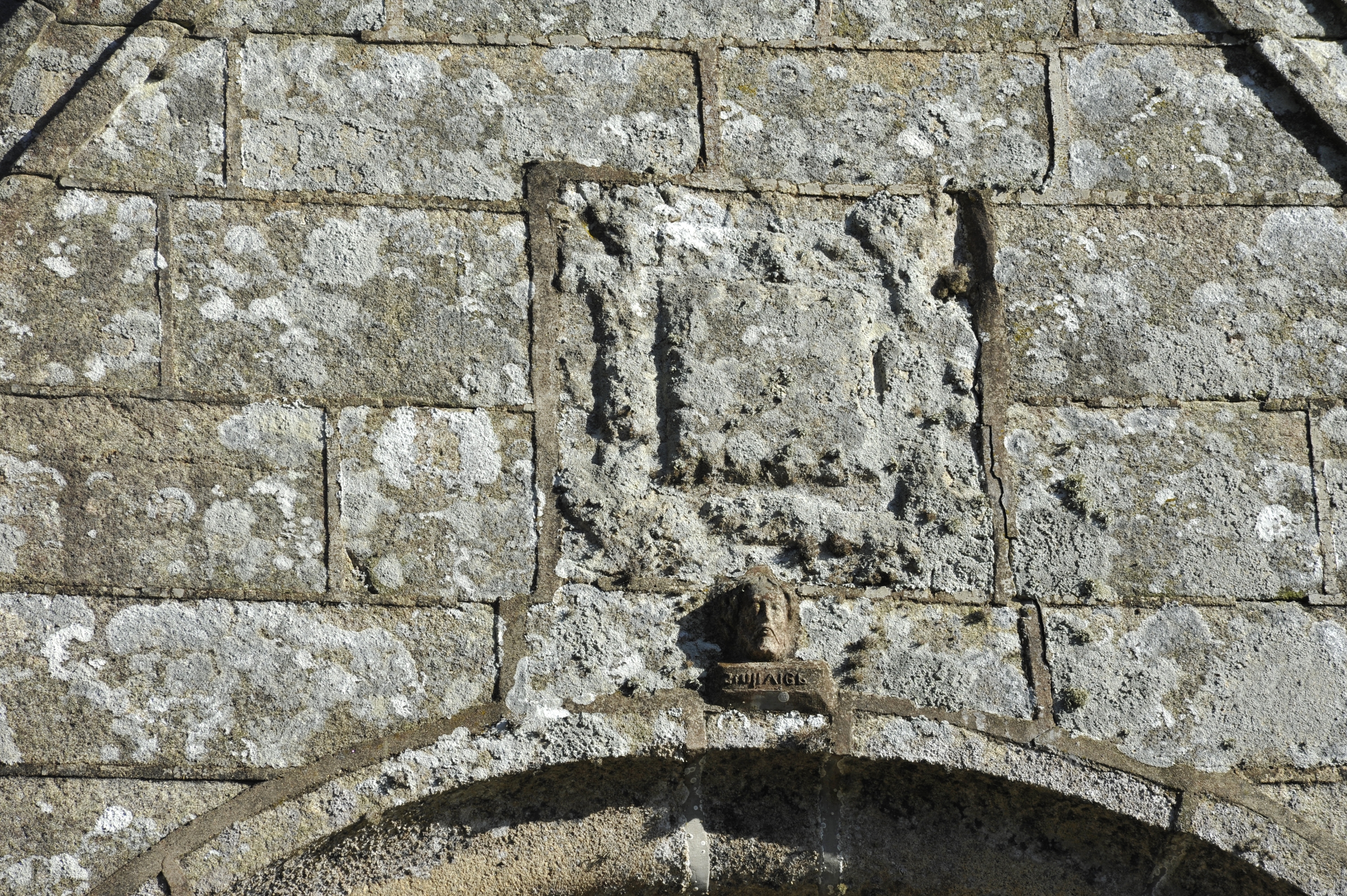Ploubezre, chapelle de Kerfons : chapelle sud au décor Renaissance, Christ (?) et armoiries marteléesImmatriculation