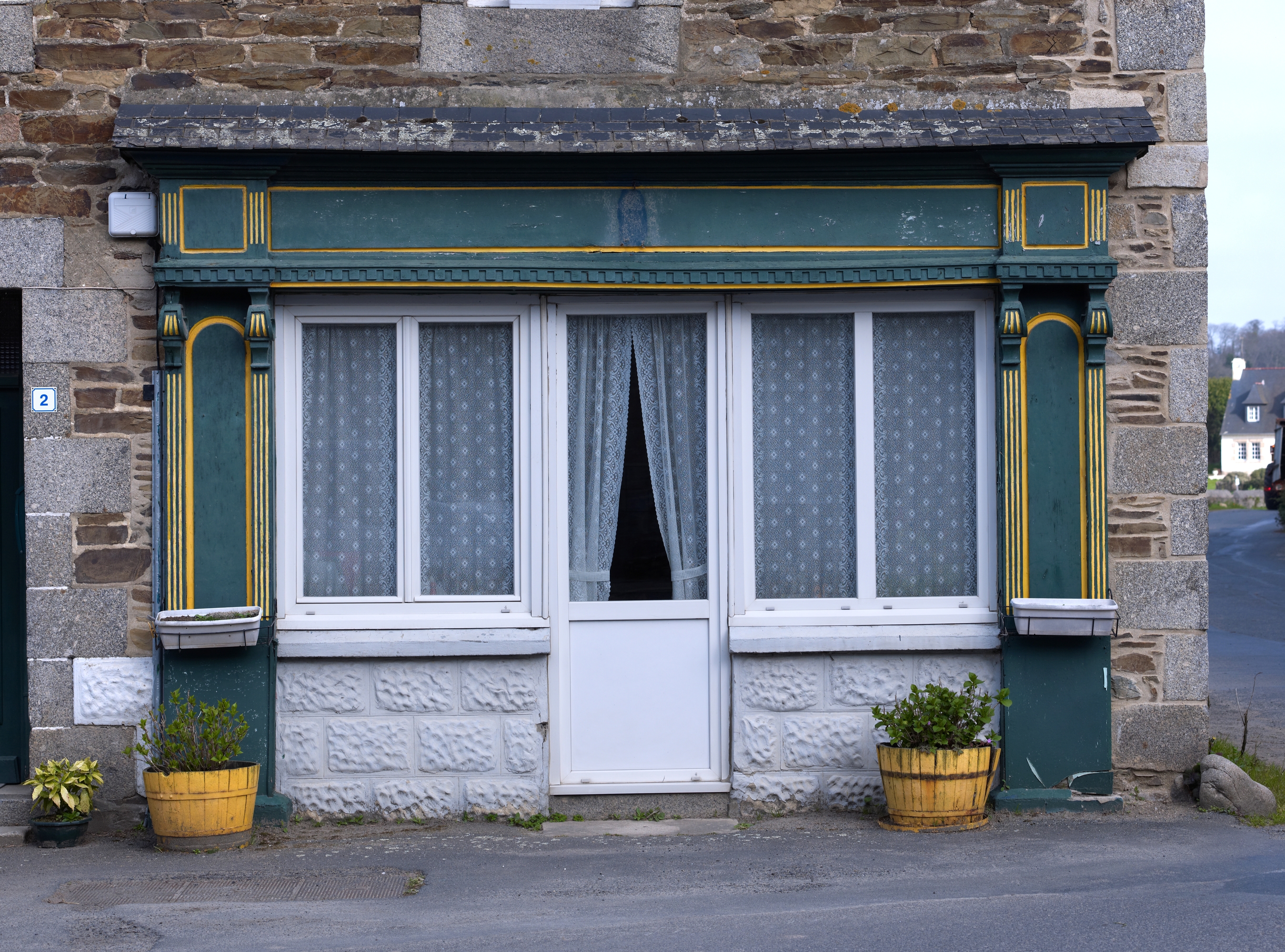Rue principale du bourg. Maison à boutique (ancienne boucherie). Détail de la vitrine. Etat début 2014Immatriculation