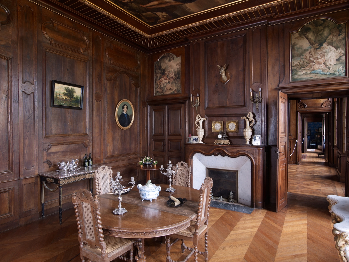 Ploubezre : château de Kergrist, vue intérieure, partie est, étage, salle à manger et sa collection d'objets anciens. Les boiseries proviendraient de l’abbaye de Beauport située près de PaimpolImmatriculation