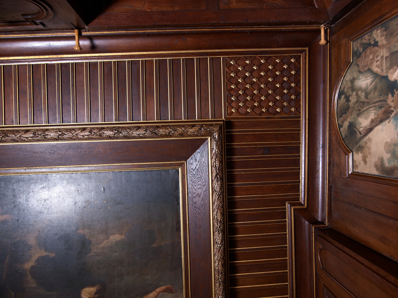 Ploubezre : château de Kergrist, vue intérieure, partie est, étage, salle à manger et sa collection d'objets anciens. Toile au plafond de Luca Giordano (1634-1705) : "La rencontre de Bacchus et Ariane", détail du montage, cadre rappelant le drapeau "étoiles et bandes" des états unis d'amériqueImmatriculation