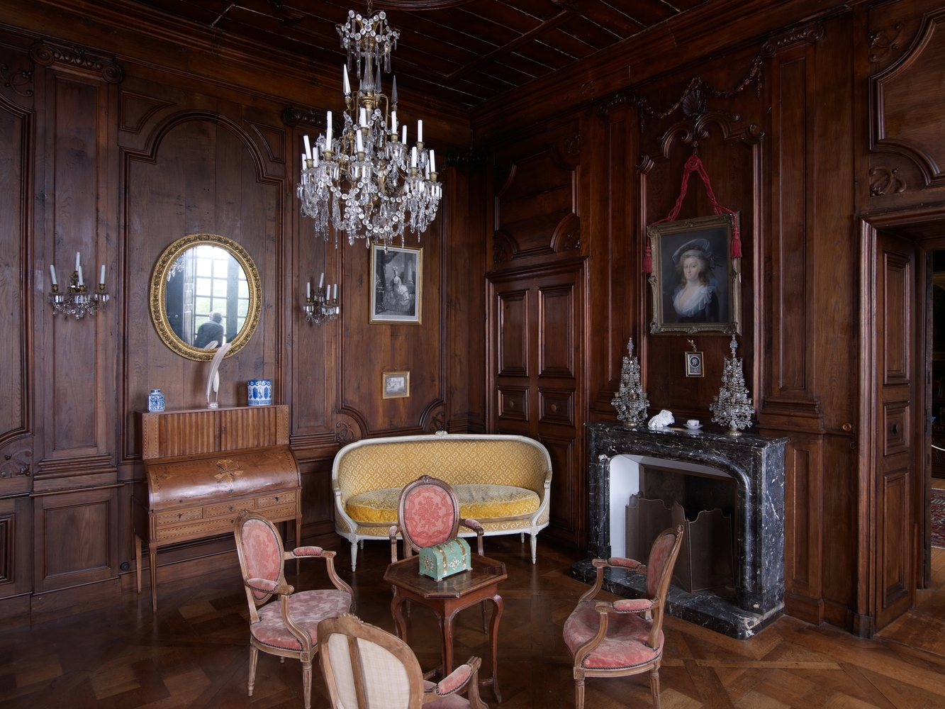 Ploubezre : château de Kergrist, vue intérieure, partie est, étage, salon et sa collection d'objets anciensImmatriculation