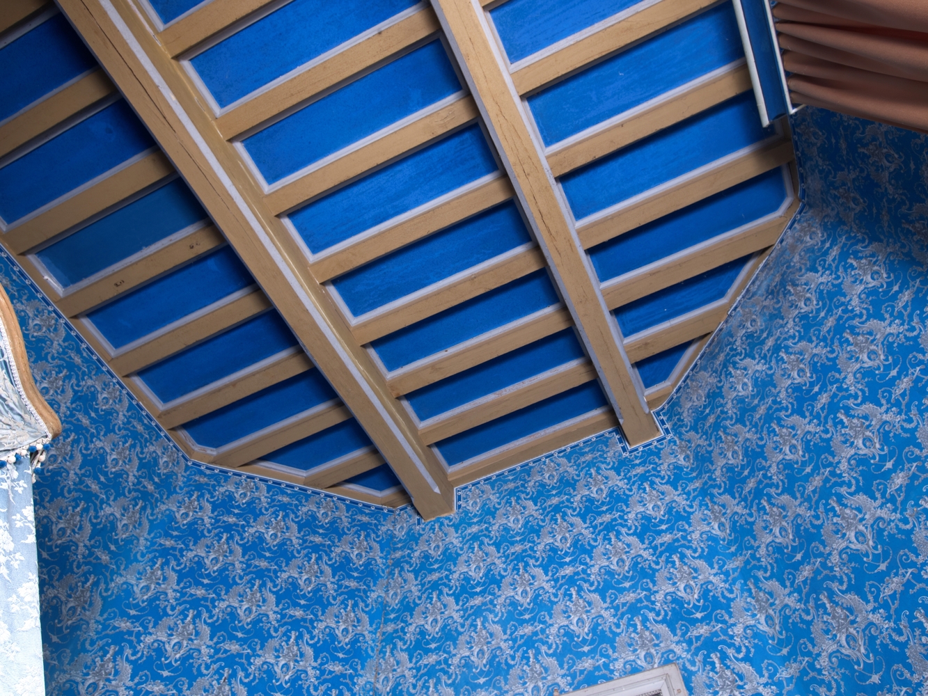 Ploubezre : château de Kergrist, vue intérieure, partie est, étage, "chambre bleue" et sa collection d'objets anciens. Détail du plafondImmatriculation