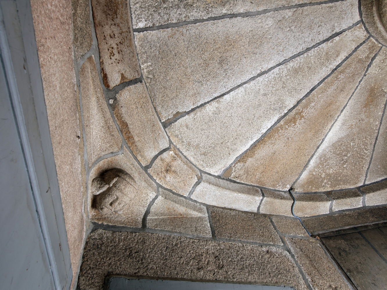 Ploubezre : château de Kergrist, vue intérieure, escalier en vis, plafond en dalle rayonnante supporté par un pilier en granite. Détail de l'ornementation : représentation du seigneur (?)Immatriculation