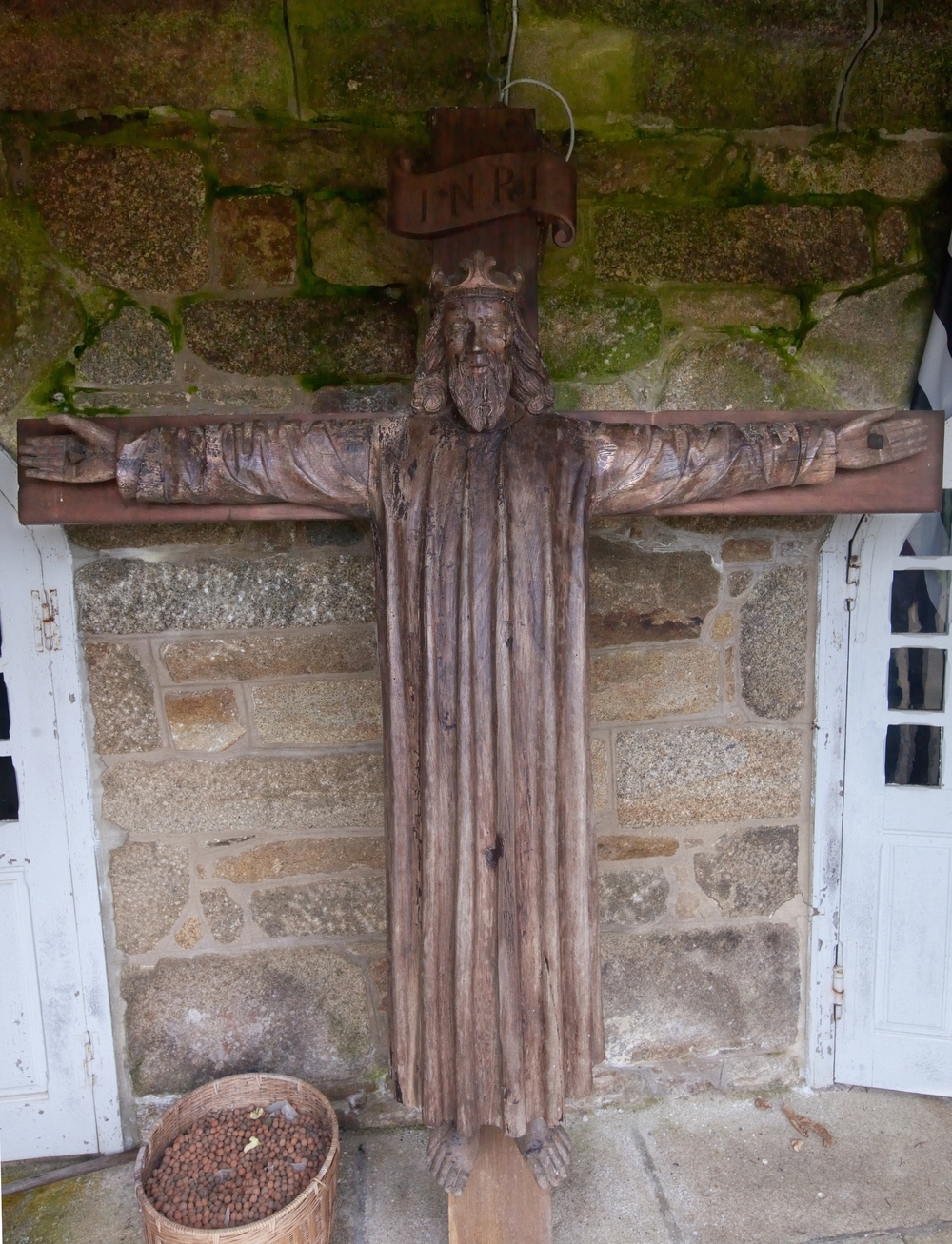 Ploubezre : château de Kergrist, Christ en croix avec la sainte couronne surmonté du titulus (statue désormais conservée dans le bâtiment d'accueil)Immatriculation